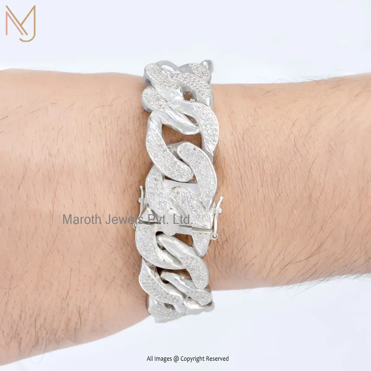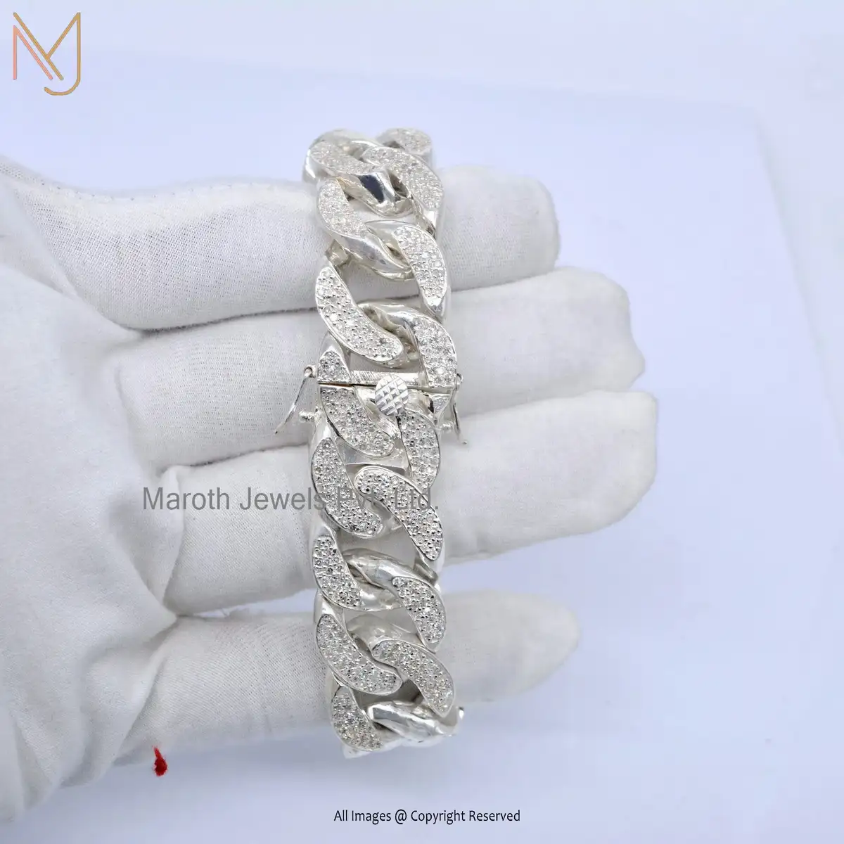 14K Solid White Gold Cubic Zircon Curb Man's Designer Chain Bracelet Jewelry USA