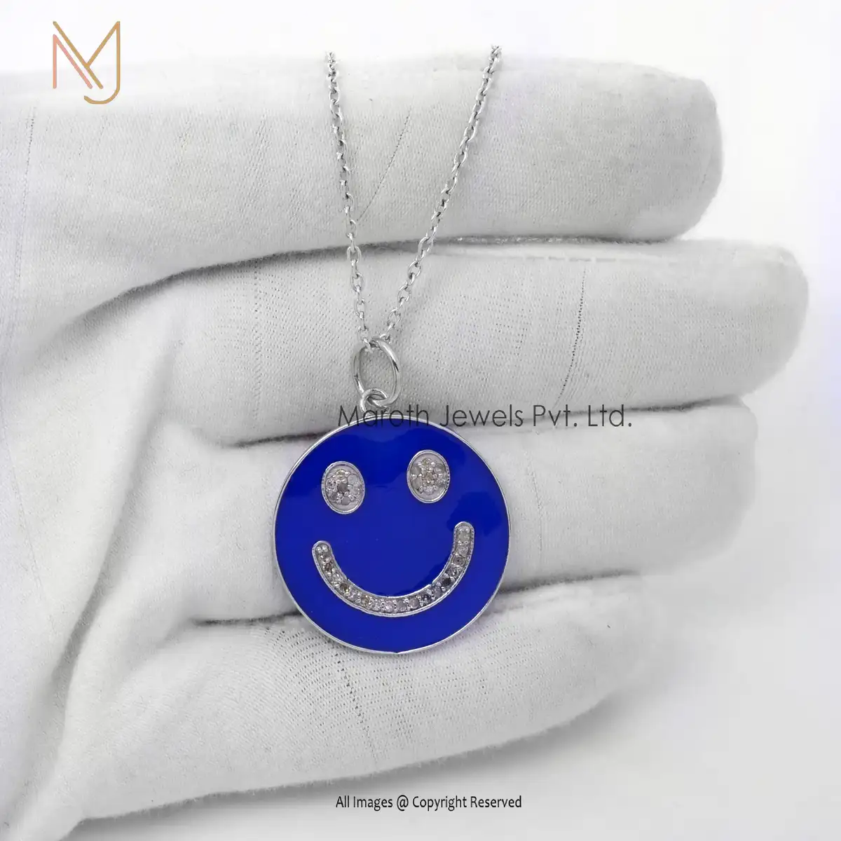 14K White Gold Blue Enamel & Diamond Smiley Pendant Jewelry Supplier