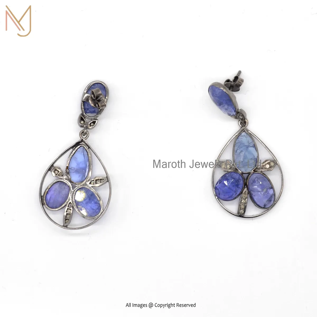 14K White Gold Pave Diamond Tanzanite Gemstone Drop Earring Custom Jewelry