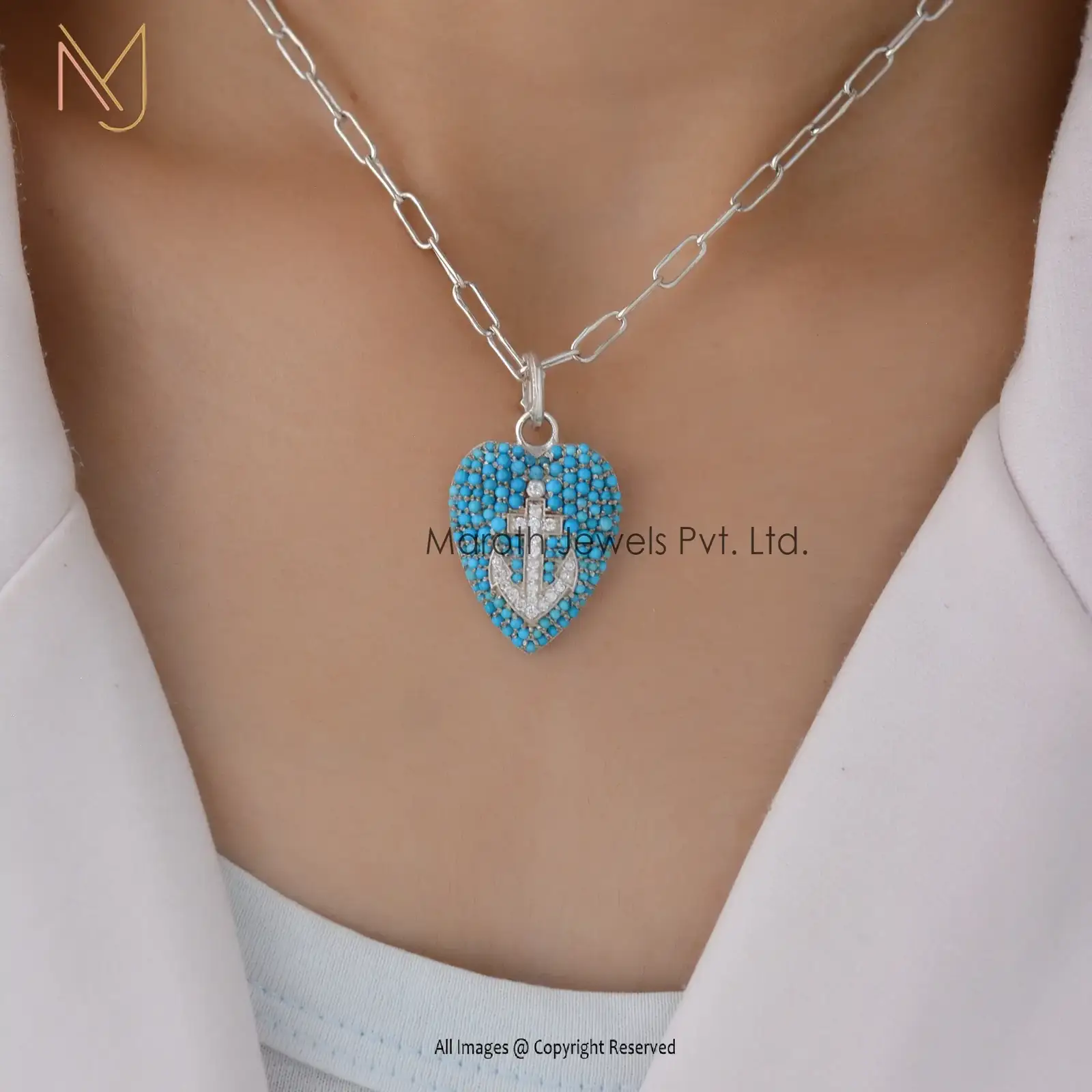 14K White Gold Turquoise & White Topaz Heart Pendant For Necklace USA