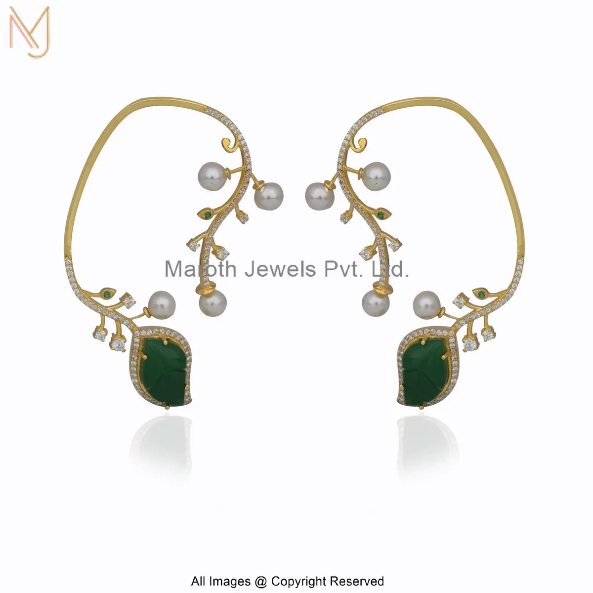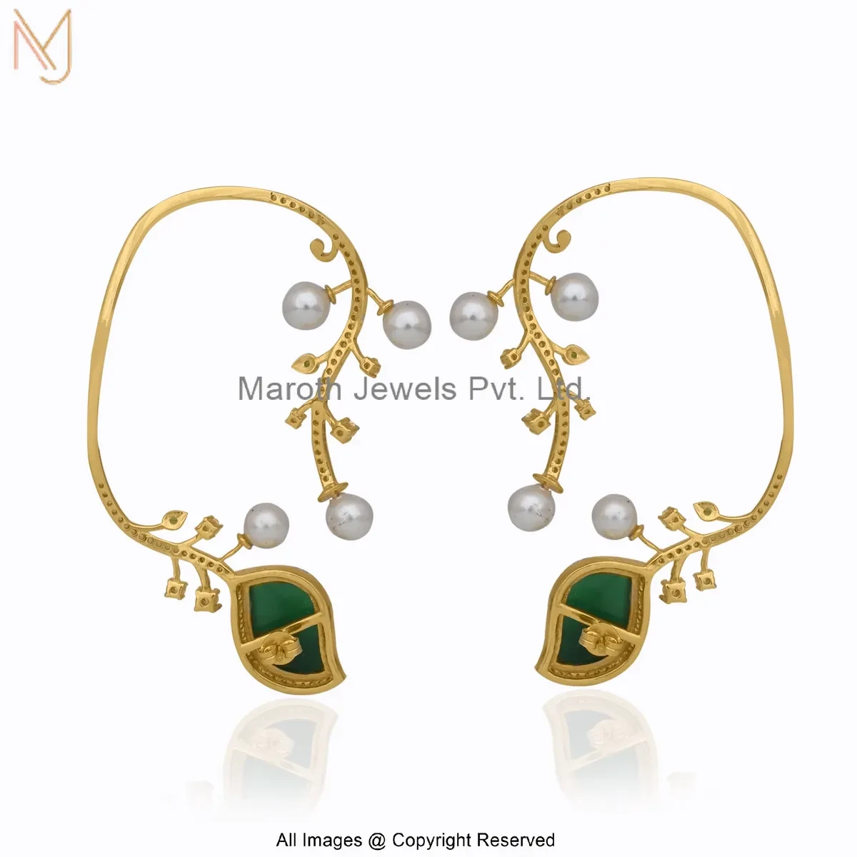 14K Yellow Gold Cubic Zircon Emerald Pearl Vine Ear Cuff Earring Custom Jewelry