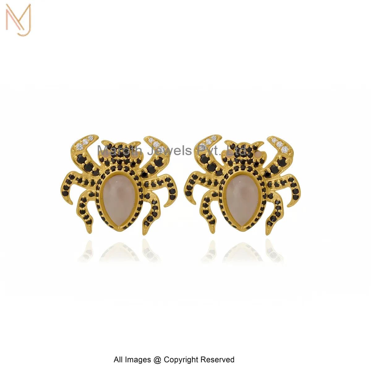 14K Yellow Gold Diamond Black Cubic Zircon Pink Onyx Karkat Motif Gemstone Stud Earrings USA