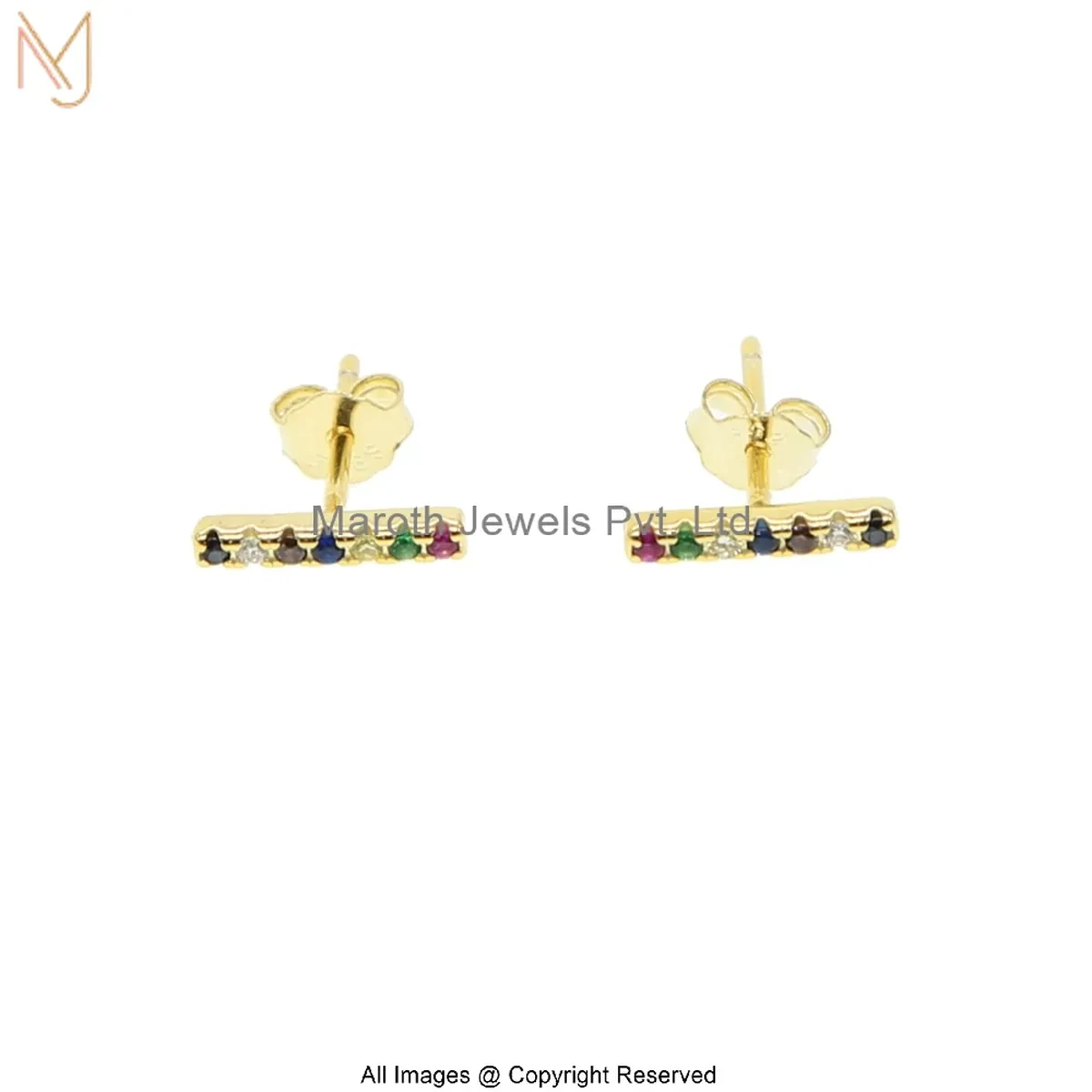 14K Yellow Gold Diamond Multi Gemstone Bar Design Stud Earring Custom Jewelry