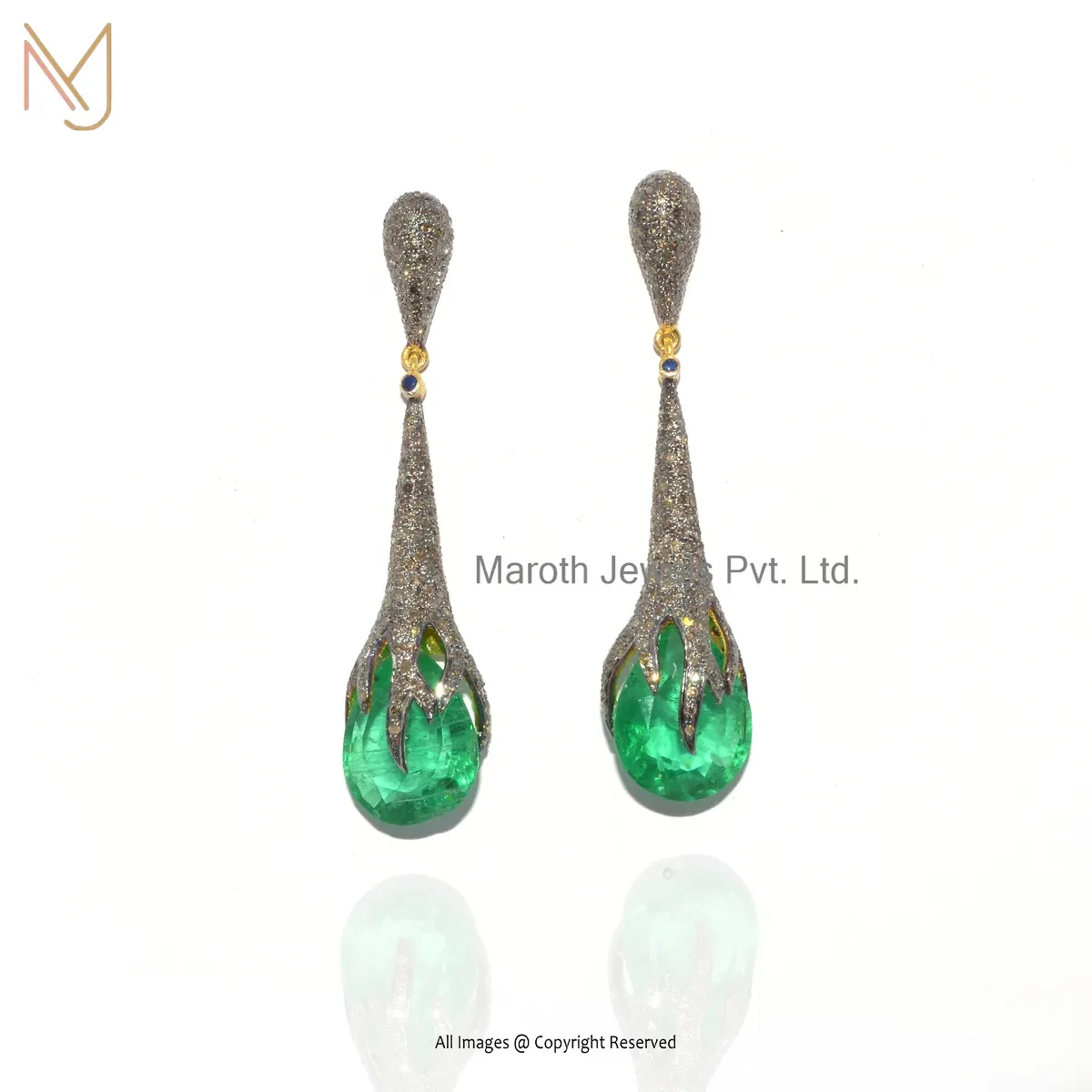 14K Yellow Gold Pave Diamond & Blue Sapphire Emerald Twilight Vine Dangler Earrings USA