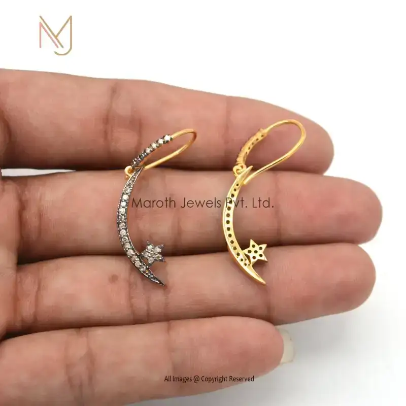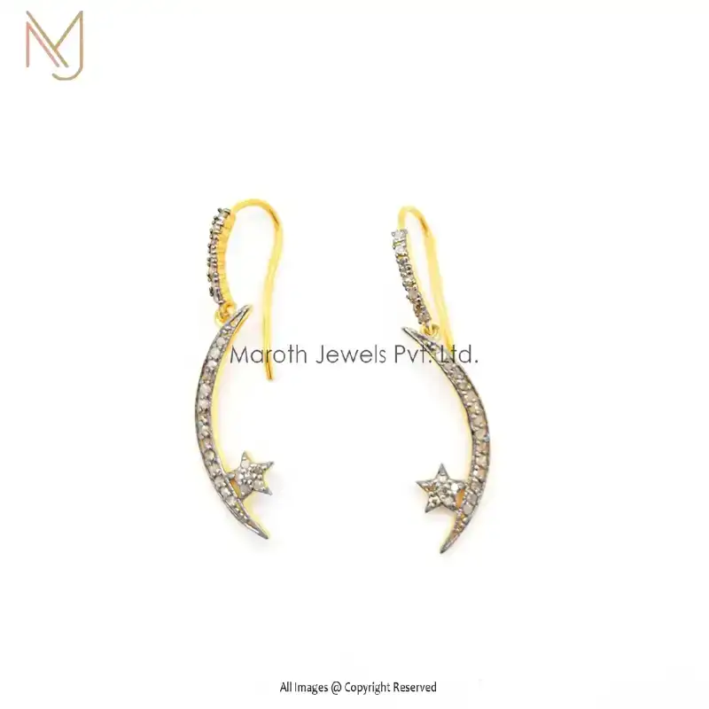 14k Yellow Gold Pave Diamond dangle Crescent Moon & Star Earring Custom Jewelry