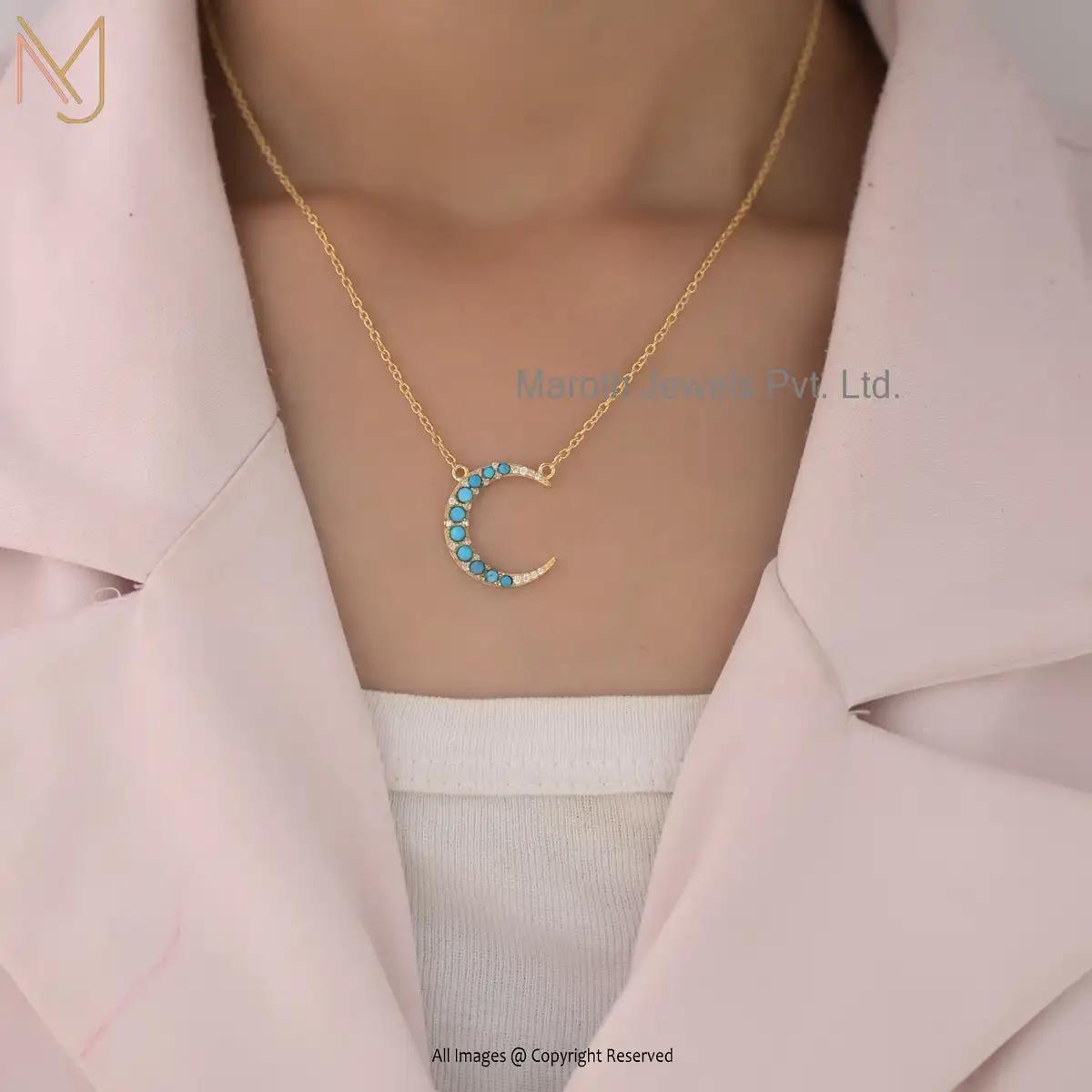 14K Yellow Gold Turquoise & Moissanite Half Moon Necklace Manufacturer