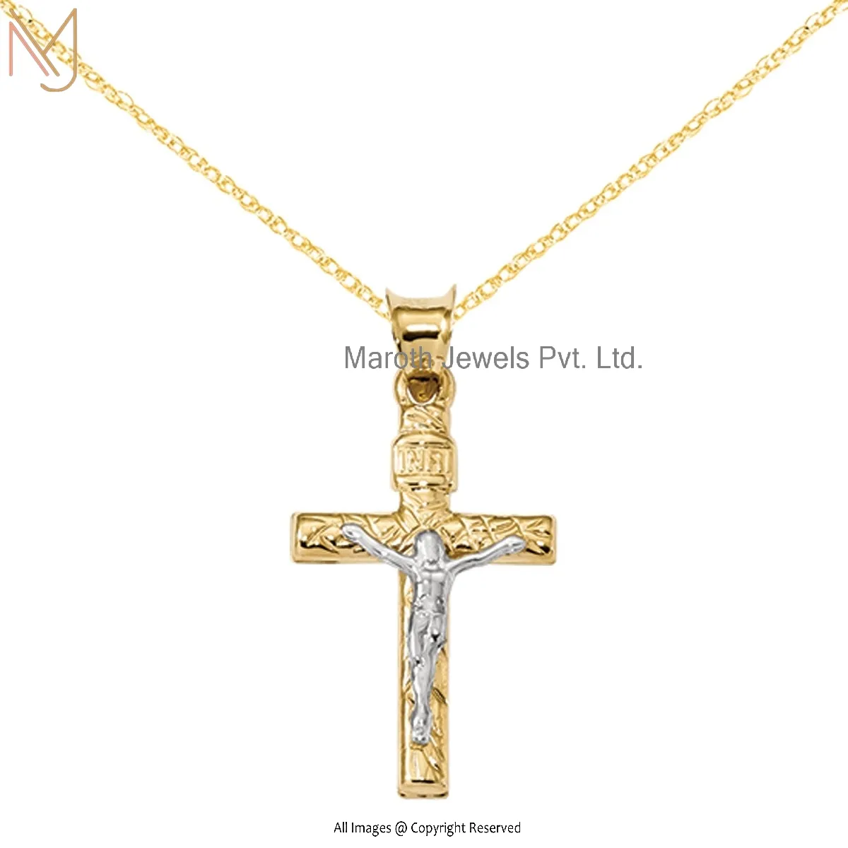 14K Yellow Gold Two-Tone Gold Polished Crucifix And Textured Pendant With Cable Rope Chain Necklace USA
