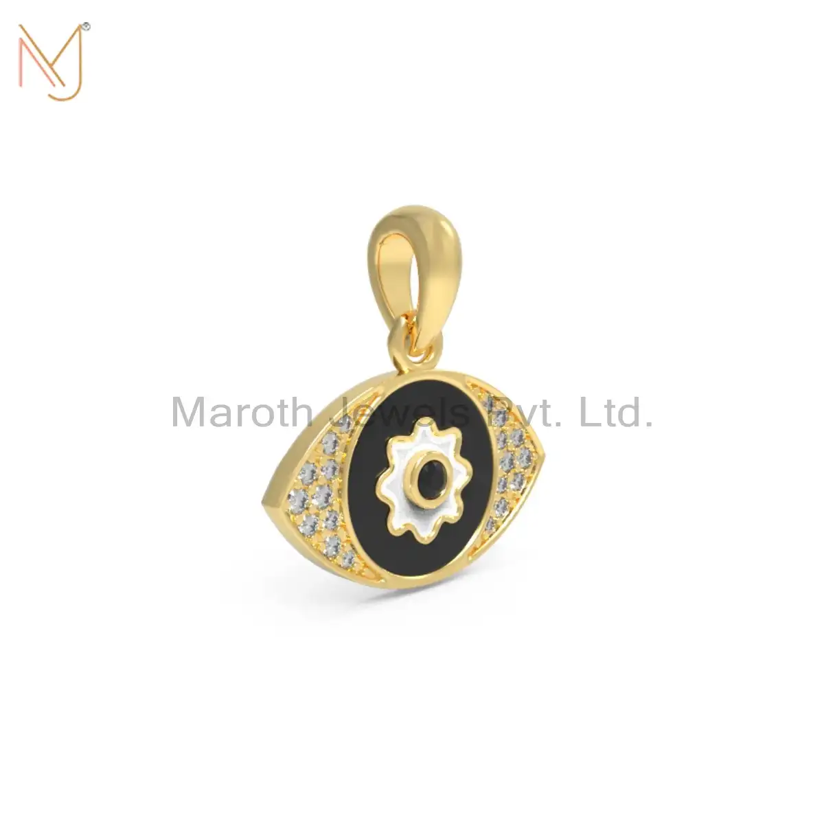 14K Yellow Gold White CZ & Black Spinel And Black Enamel Gemstone Evil Eye Charm Pendant Jewelry USA