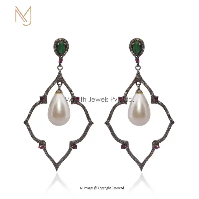 925 Silver Black Rhodium Pave Diamond Pearl And Emerald Ruby Gemstone Earring Manufacturer