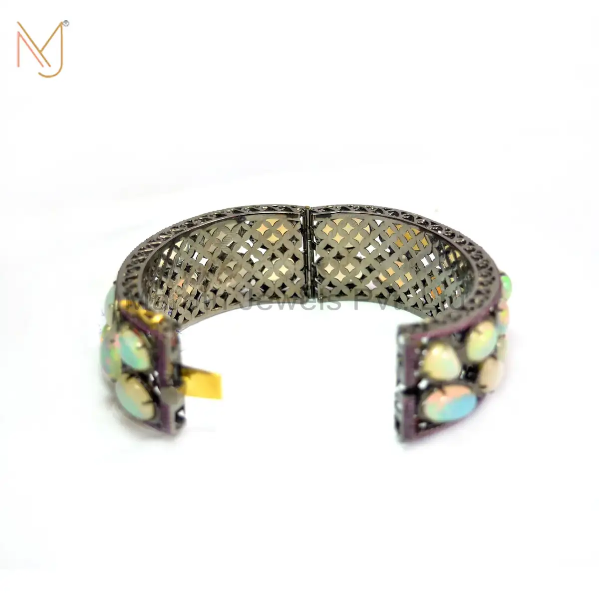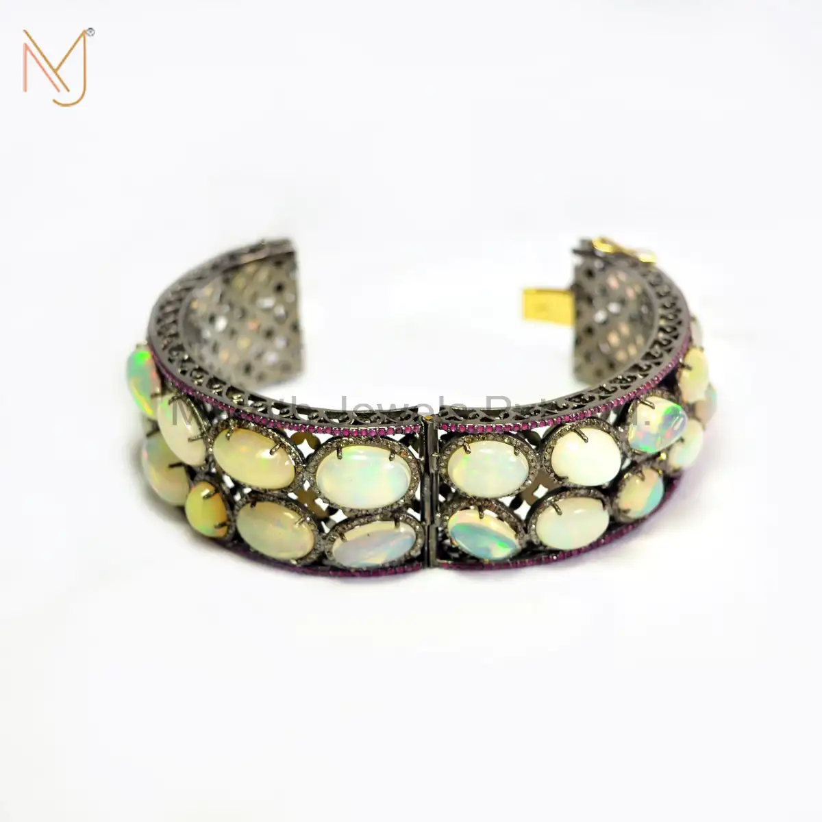 925 Silver RH Pave Diamond Ruby Gemstone & Opal Gemstone Bangle Custom Jewelry