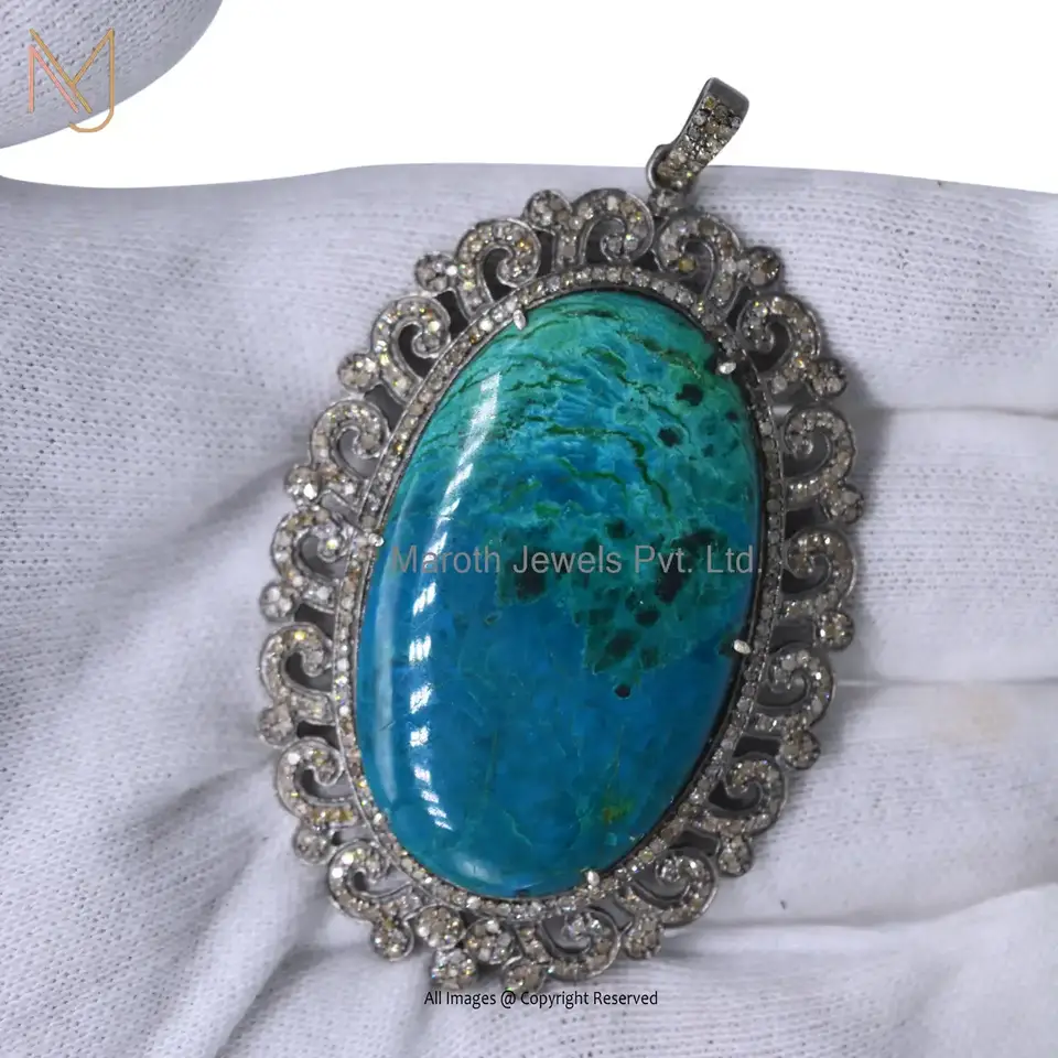 925 Silver Rhodium Chrysocolla Gemstone Pave Diamond Shell Pendant Jewelry Supplier