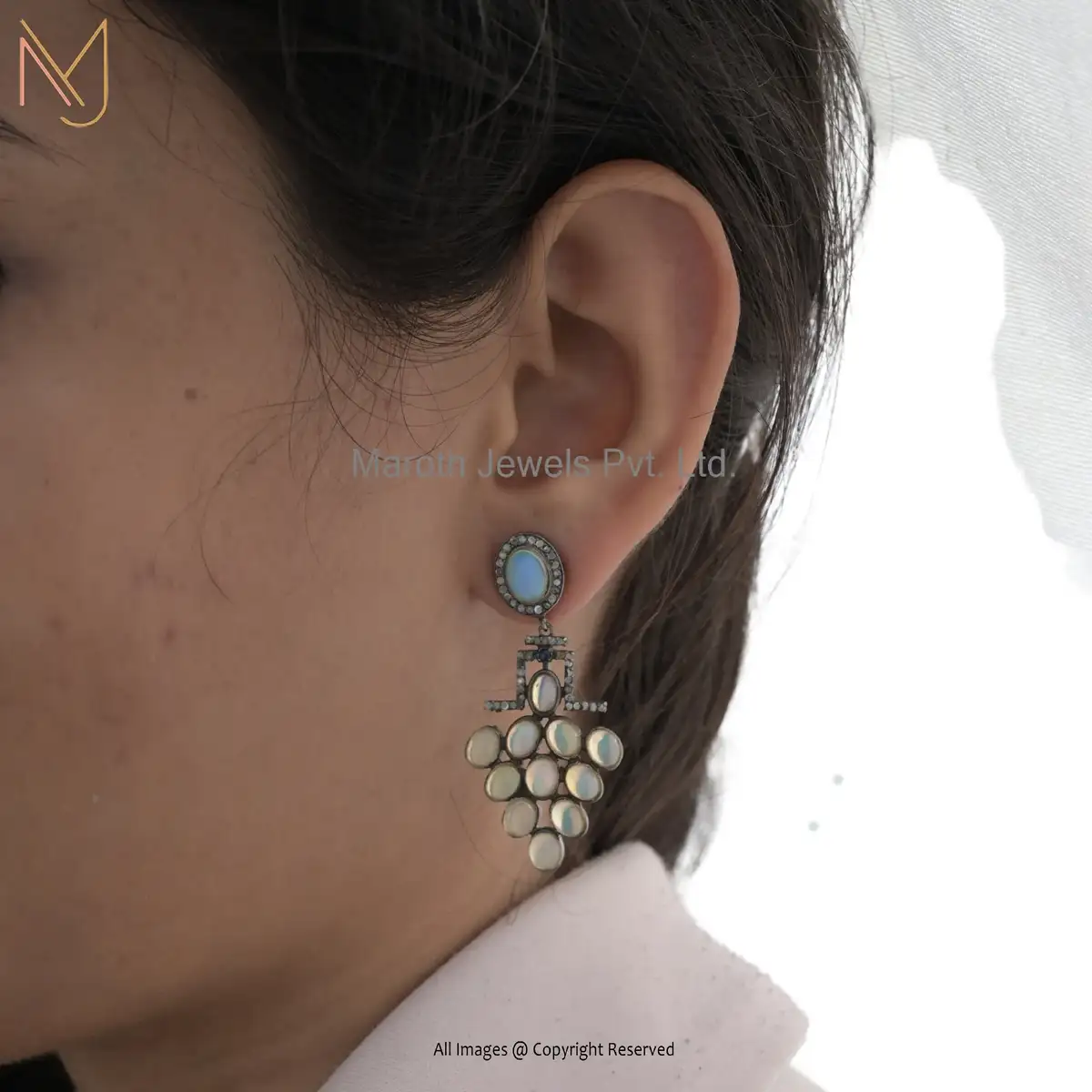 925 Silver Rhodium Opal And Diamond Beautiful Designer Drop Earring Custom Jewelry
