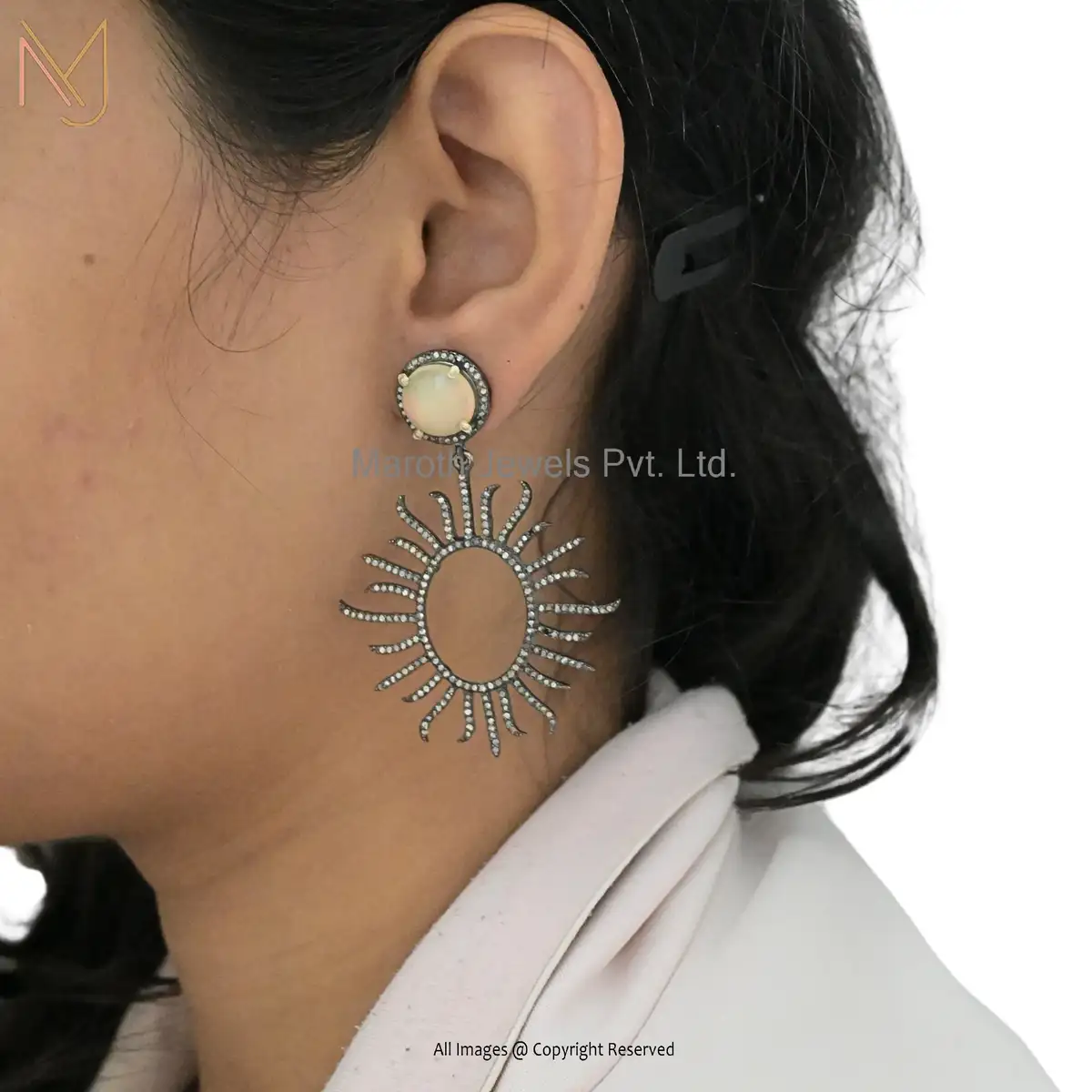 925 Silver Rhodium Opal and Diamond Sunbrust Earring Jewelry Supplier