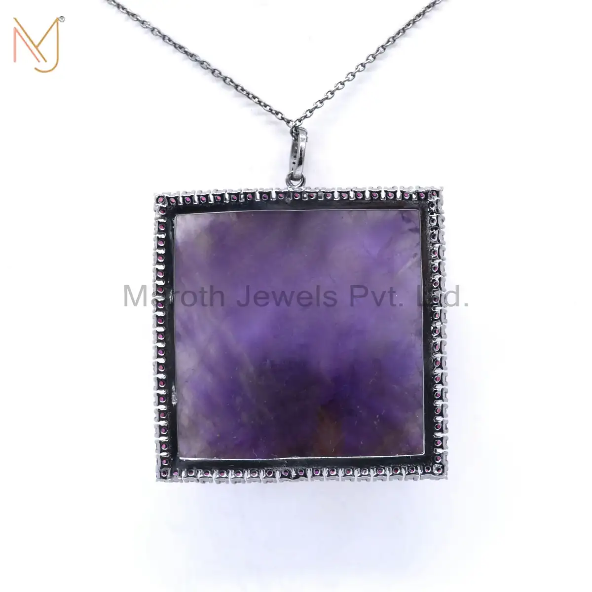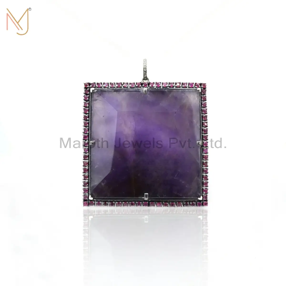 925 Silver Rhodium Pave Ruby And Amethyst Gemstone Square Pendant Necklace Jewelry USA