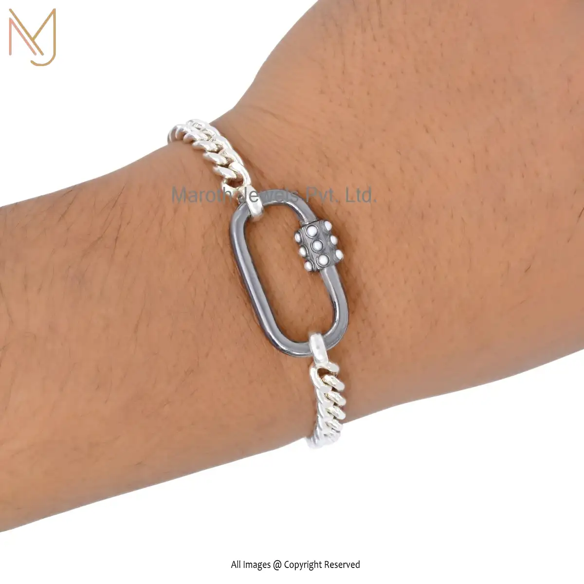 925 Silver Rhodium Plated Curb Chain Pearl Gemstone Carabiner Lock Bracelet USA