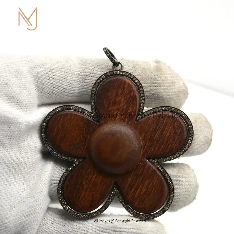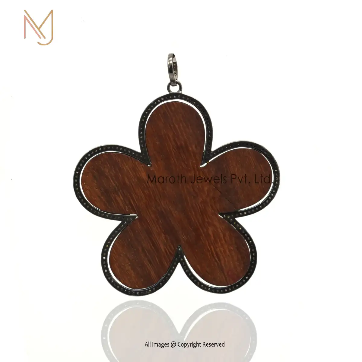925 Silver Rhodium Wooden Designs Pave Diamond Flower Pendant Jewelry Manufacturer