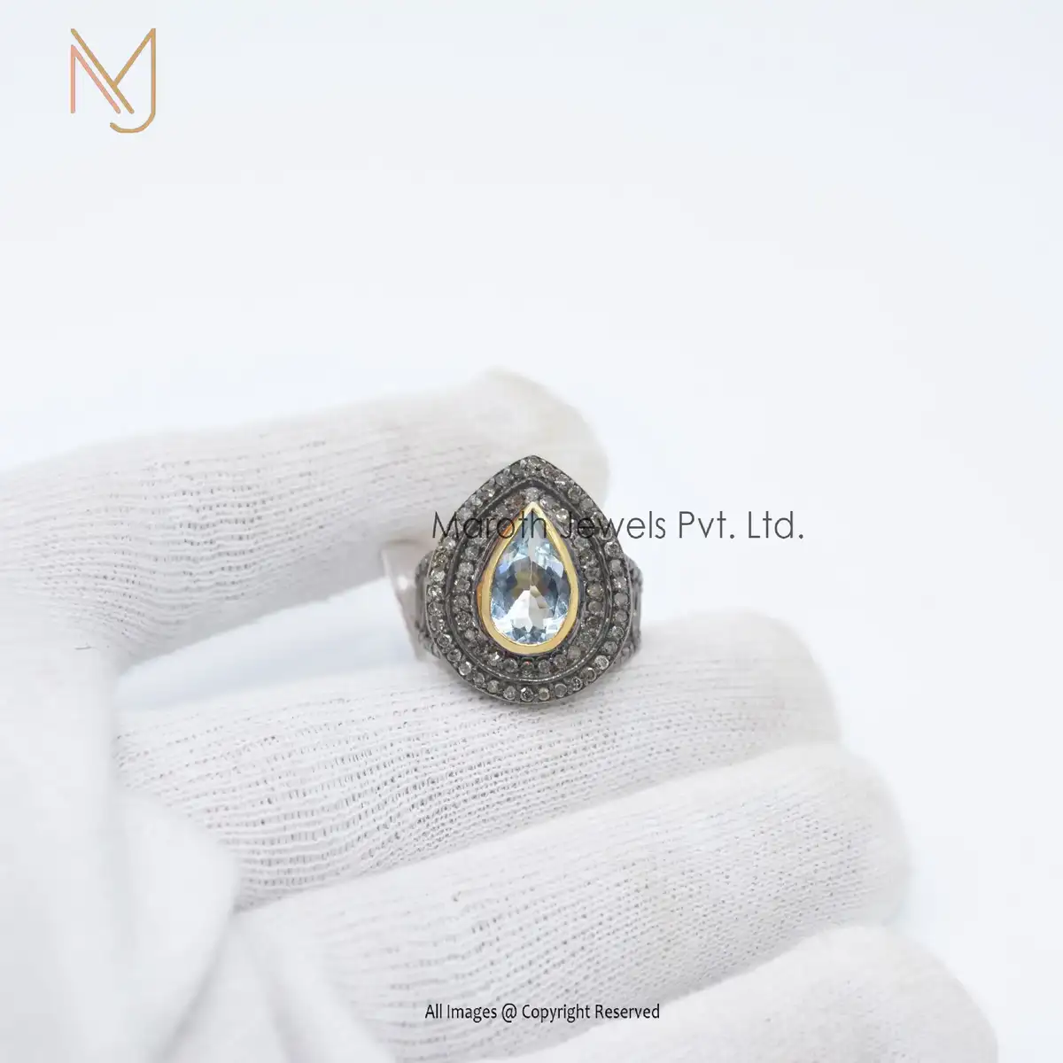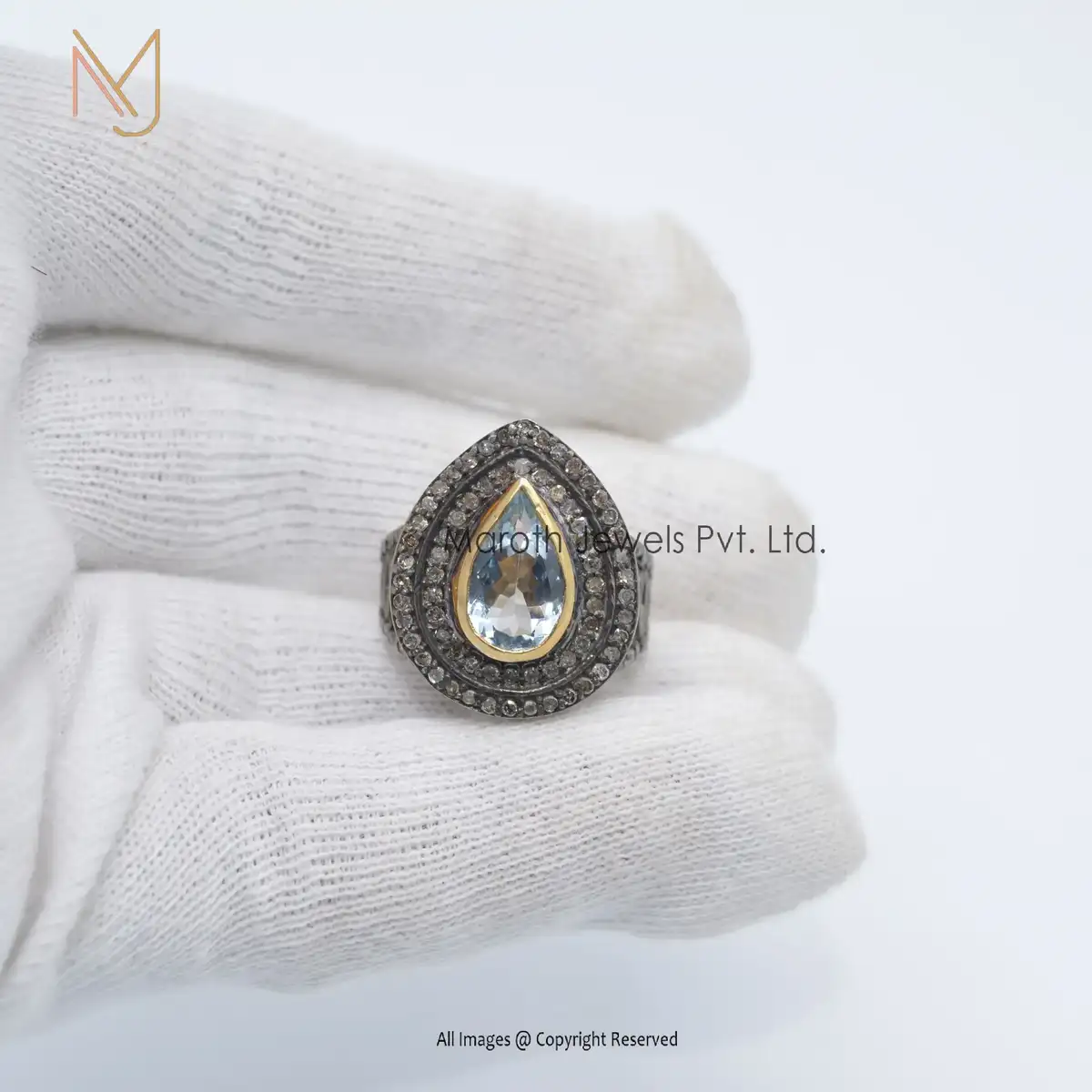 925 Silver Rhodium Yellow Gold Plated Pave Diamond Blue Topaz Gemstone Ring Manufacturer