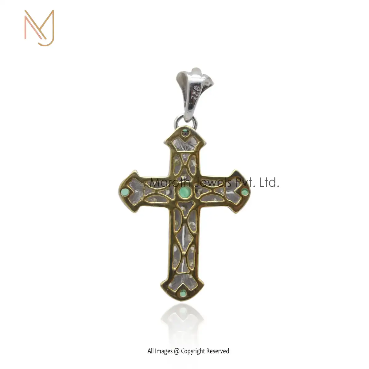 925 Silver White Gold Plated Pave Diamond And Emerald Cross Pendant Jewelry