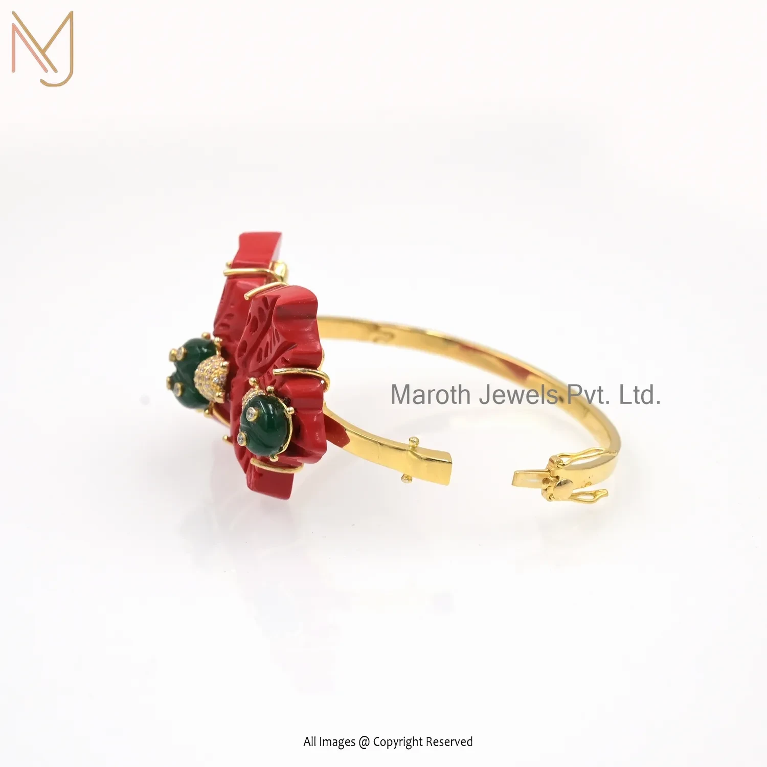 925 Silver Yellow Gold Plated Green Enamel & Red Coral And Flower Gemstone Bangle Jewelry Manufacturer