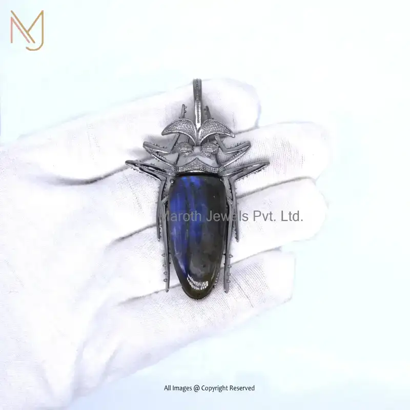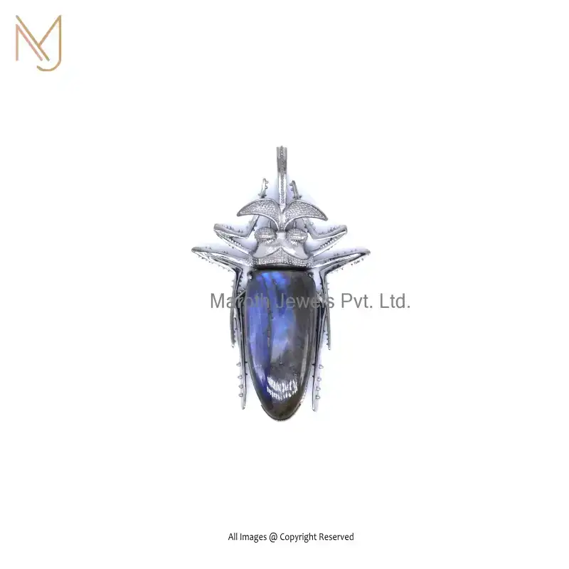 925 Sterling Silver Rhodium Plated Labradorite Bug Blue Enamel & Multi Gemstone Pendant USA