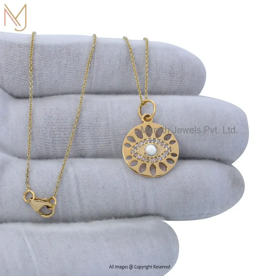 Private Label 925 Silver White Gold Diamond And Opal Gemstone Evil Eye Pendant Necklace