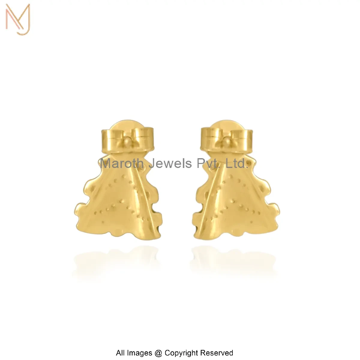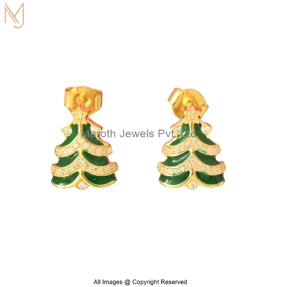 Private Lable 14K Yellow Gold Cubic Zircon Green Enamel Christmas Tree Stud Earrings