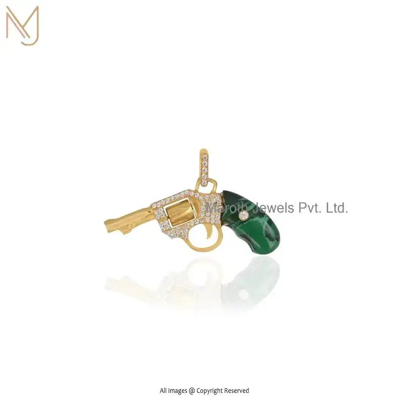 Private Lable 14K Yellow Gold Malachite And White CZ Gun Gemstone Pendant