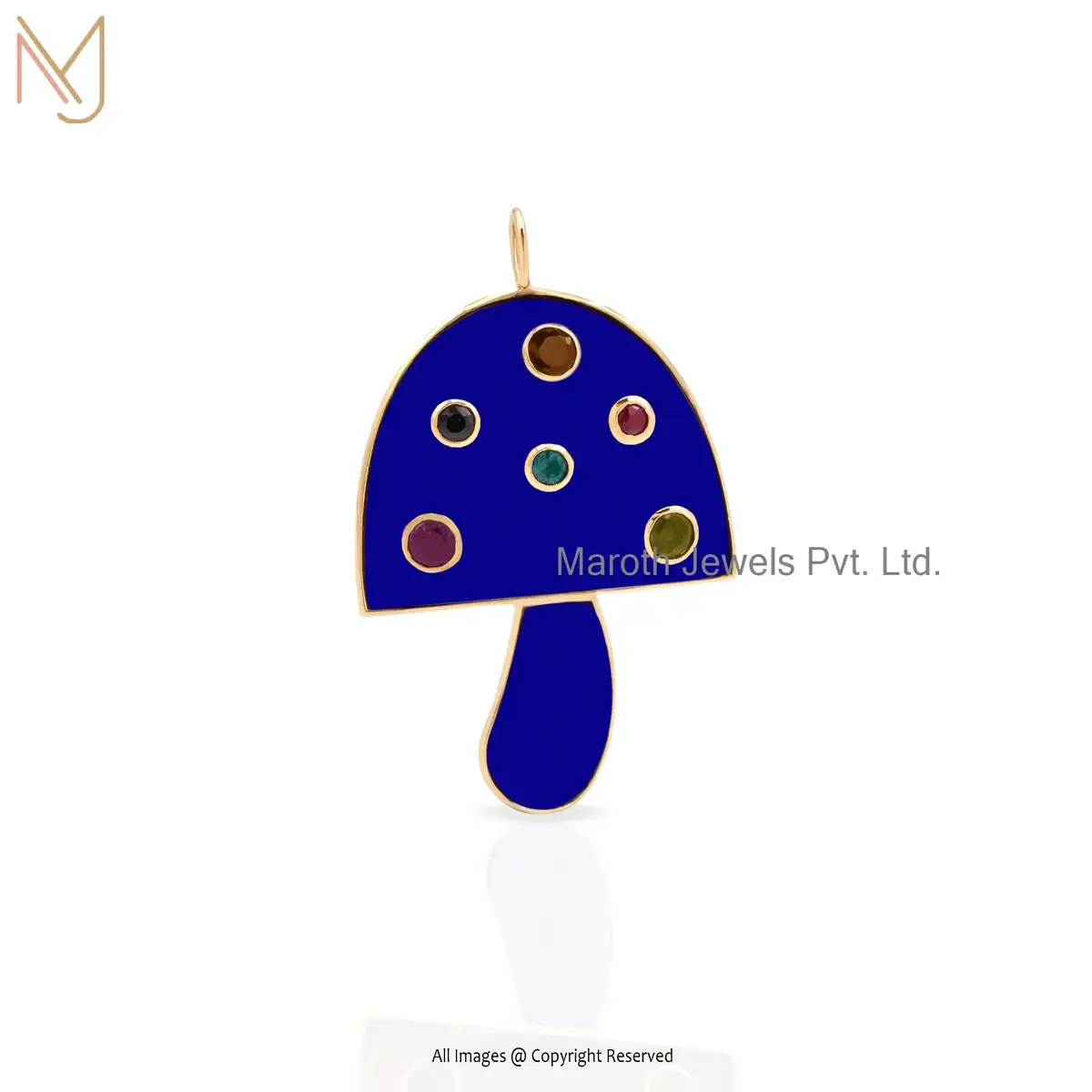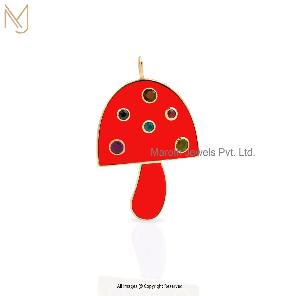 Private Lable 14K Yellow Gold Multi Gemstone Enamel Mushroom Pendant Jewelry