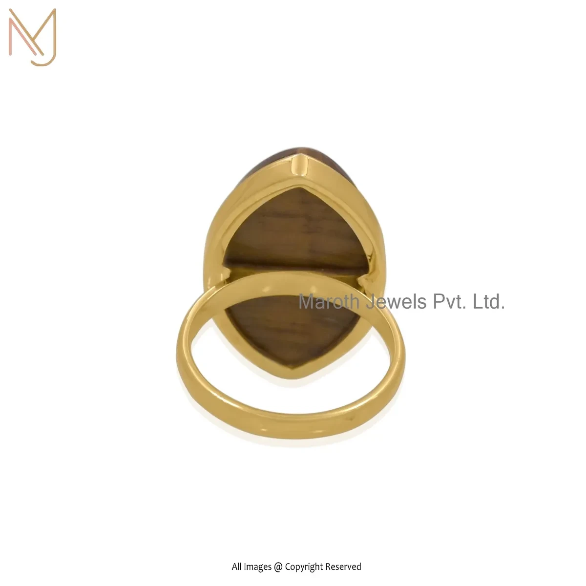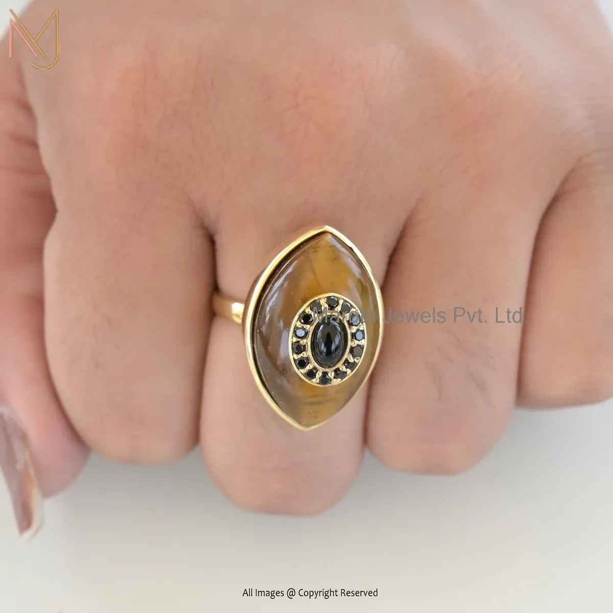 Private Lable 14K Yellow Gold Tiger Eye And Cubic Zircon Evil Eye Ring
