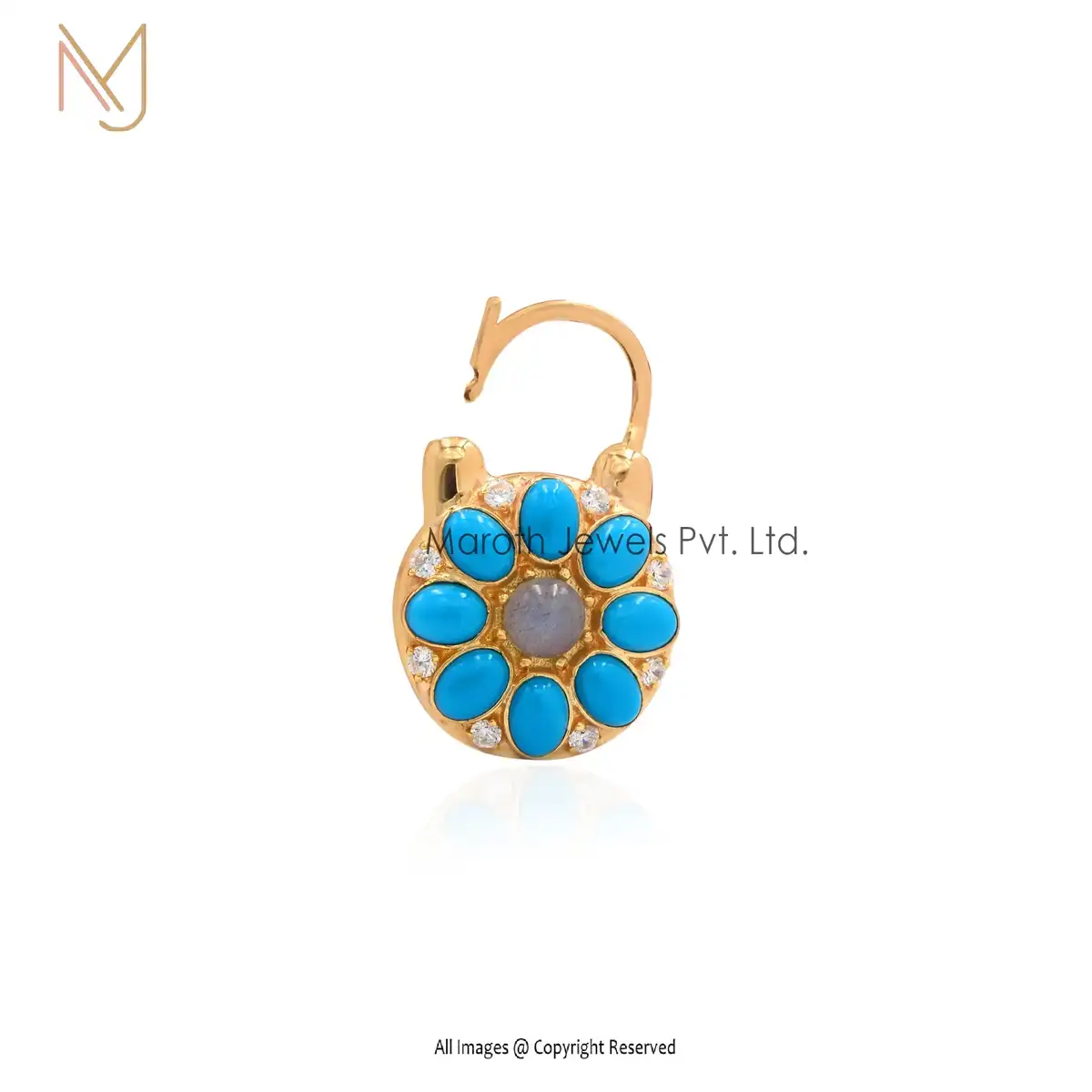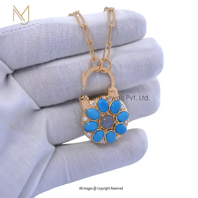 Private Lable 14K Yellow Gold Turquoise Gemstone Labradorite White Topaz Padlock Pendant Jewelry
