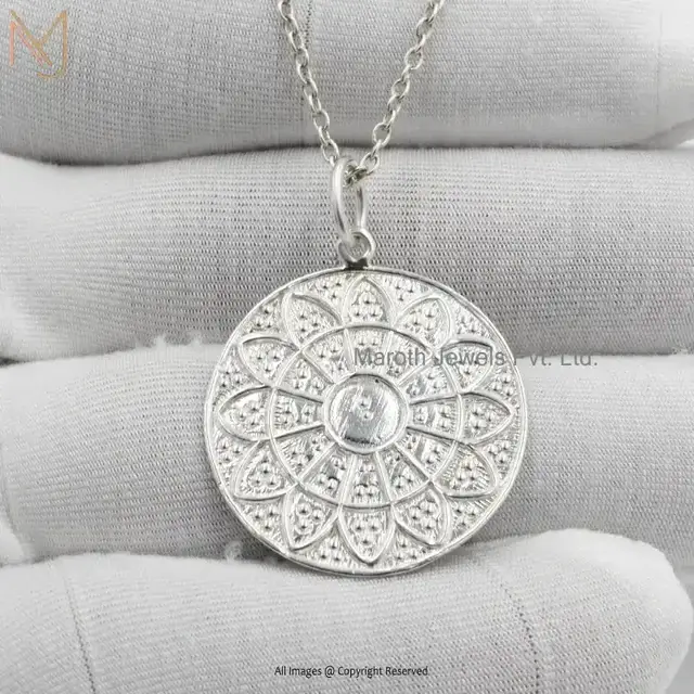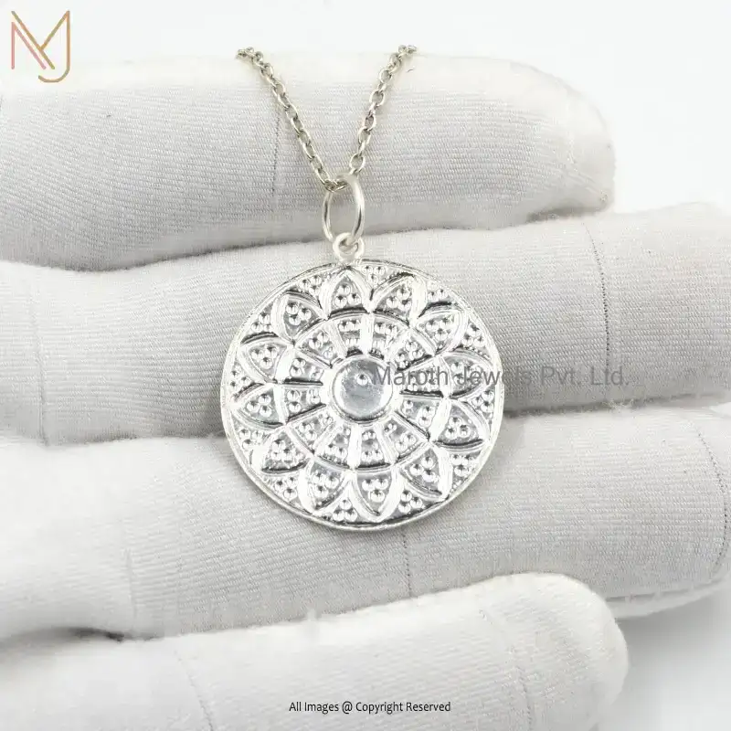 Private Lable 925 Silver Yellow Gold Plated Flower Engraving Disc Pendant Jewelry