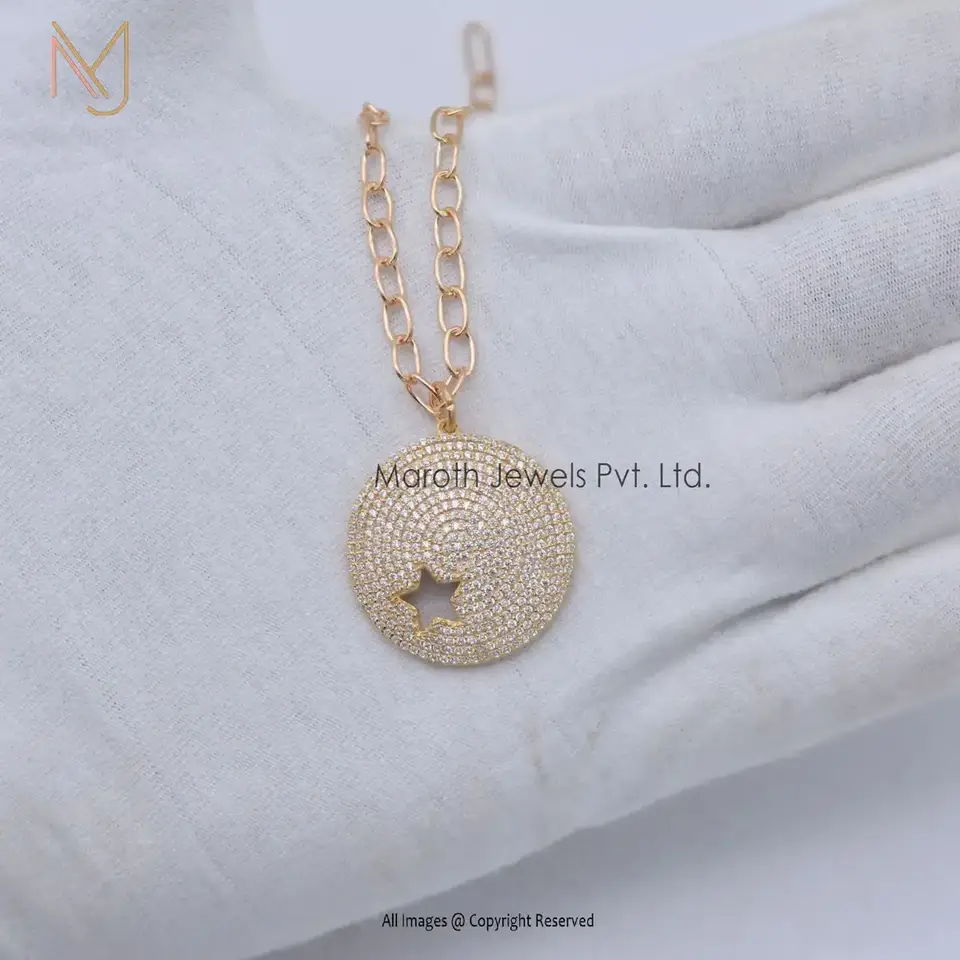 Private Lable 925 Silver Yellow Gold Solid Pave Diamond Star Disk Pendant Jewelry