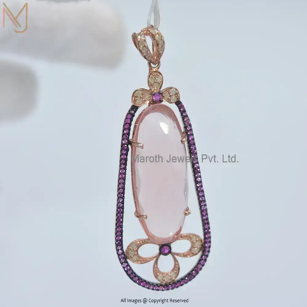 Private Lable 925 Sterling Silver Rhodium Rose Gold Plated Diamond Ruby & Rose Quartz Gemstone Pendant Jewelry