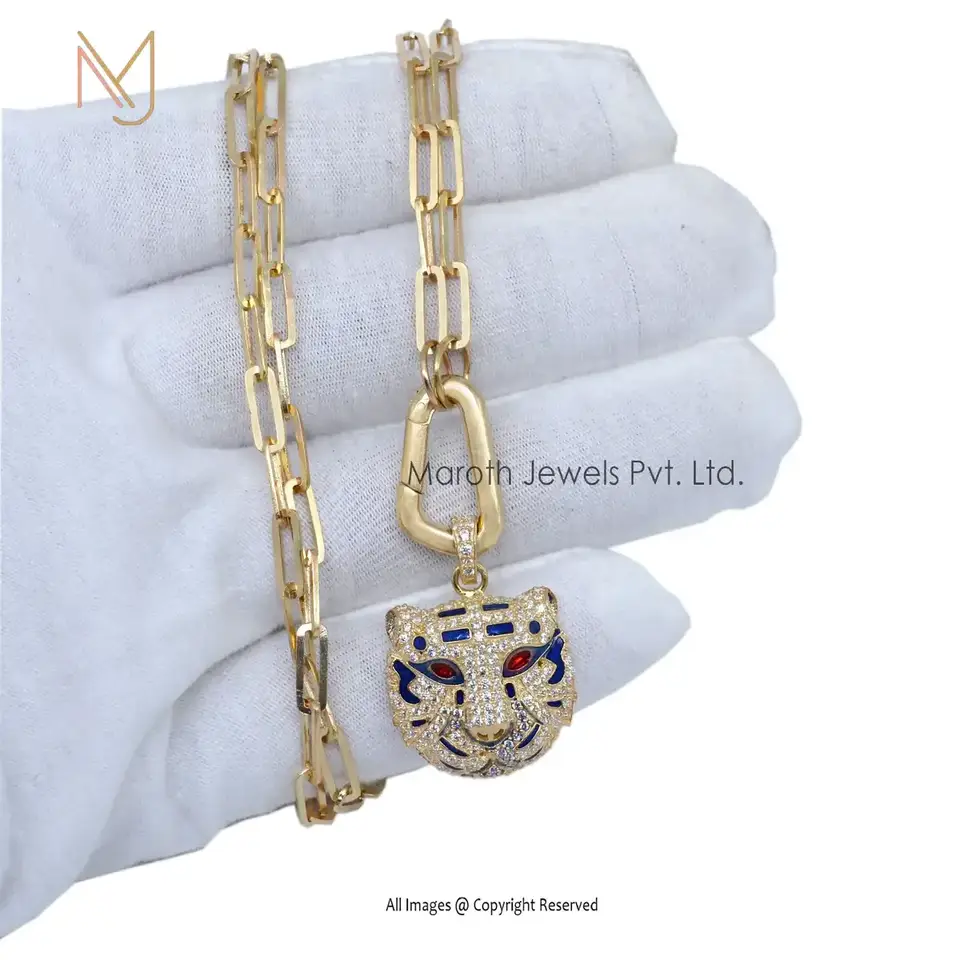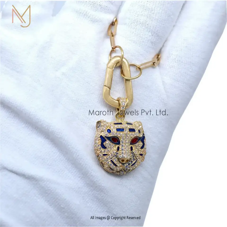 Wholesale 14K Yellow Gold Cubic Zircon Blue & Red Enamel Tiger Pendant Jewelry