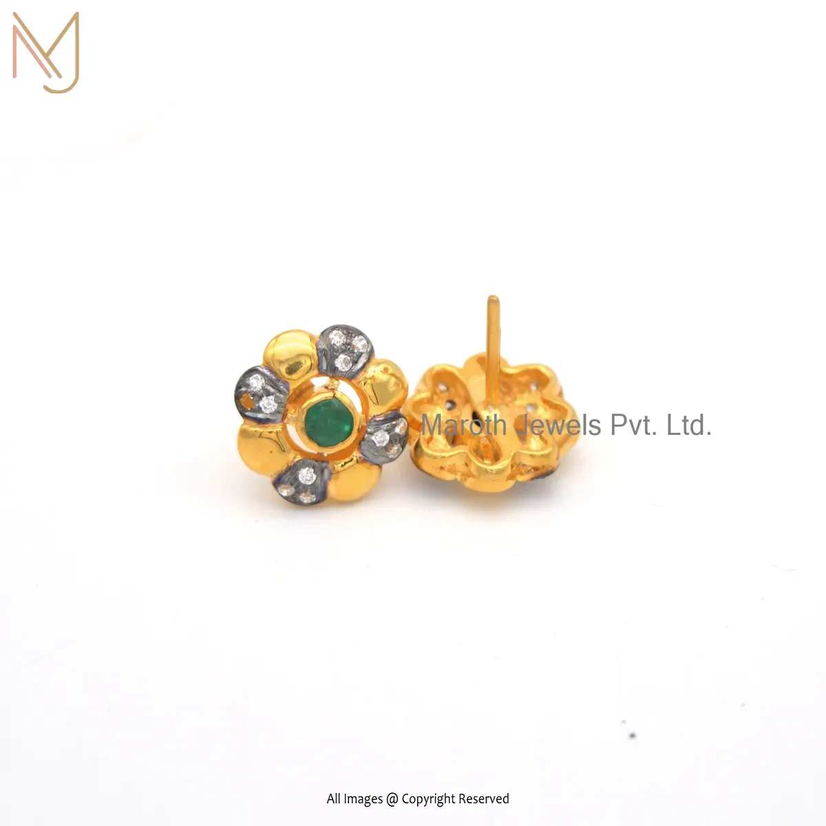 Wholesale 14K Yellow Gold Diamond Emerald Gemstone Flower Shape Stud Earring