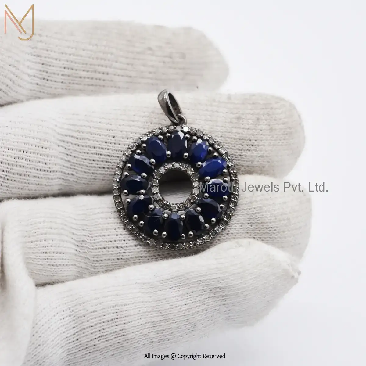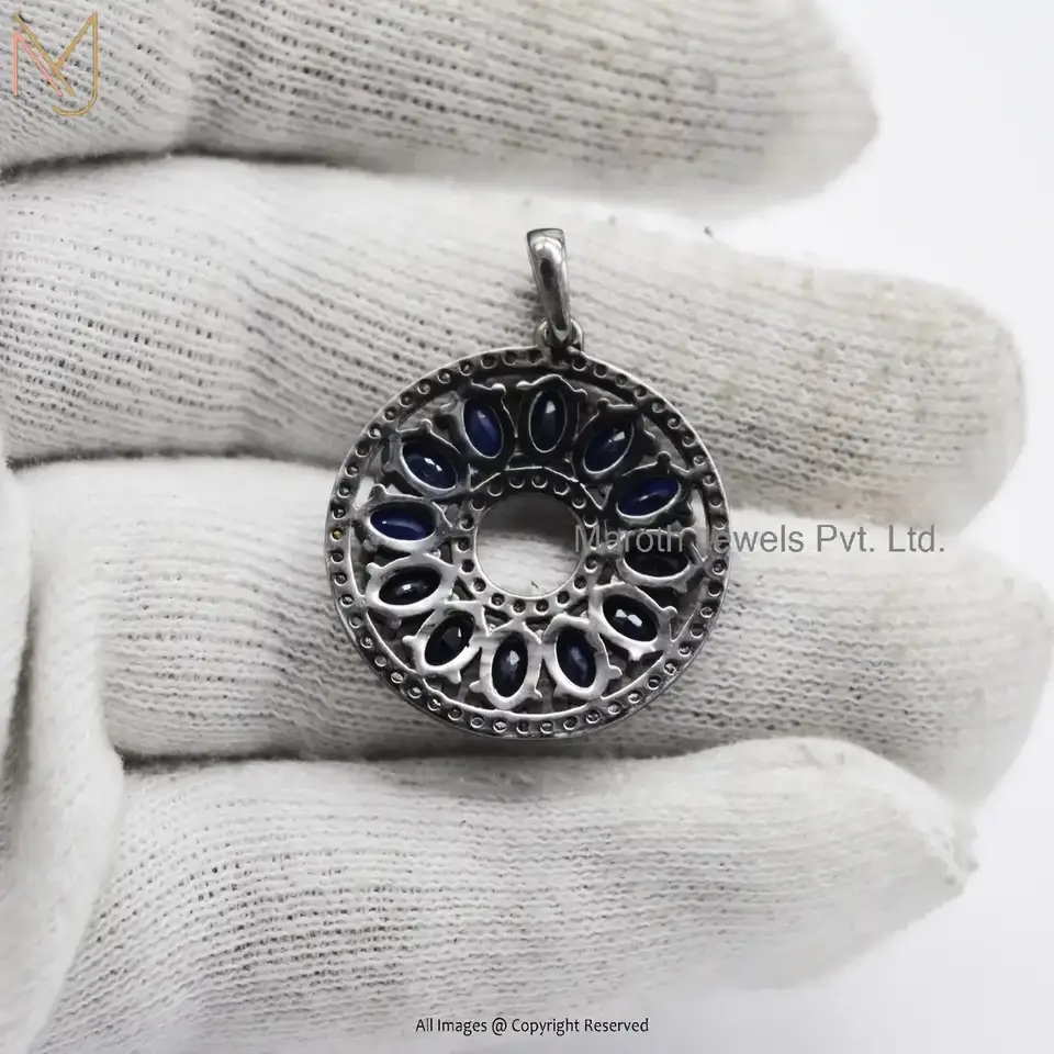 Wholesale 925 Silver Black Rhodium Plated Diamond & Blue Sapphire Gemstone Round Disc Circular Pendant Jewelry