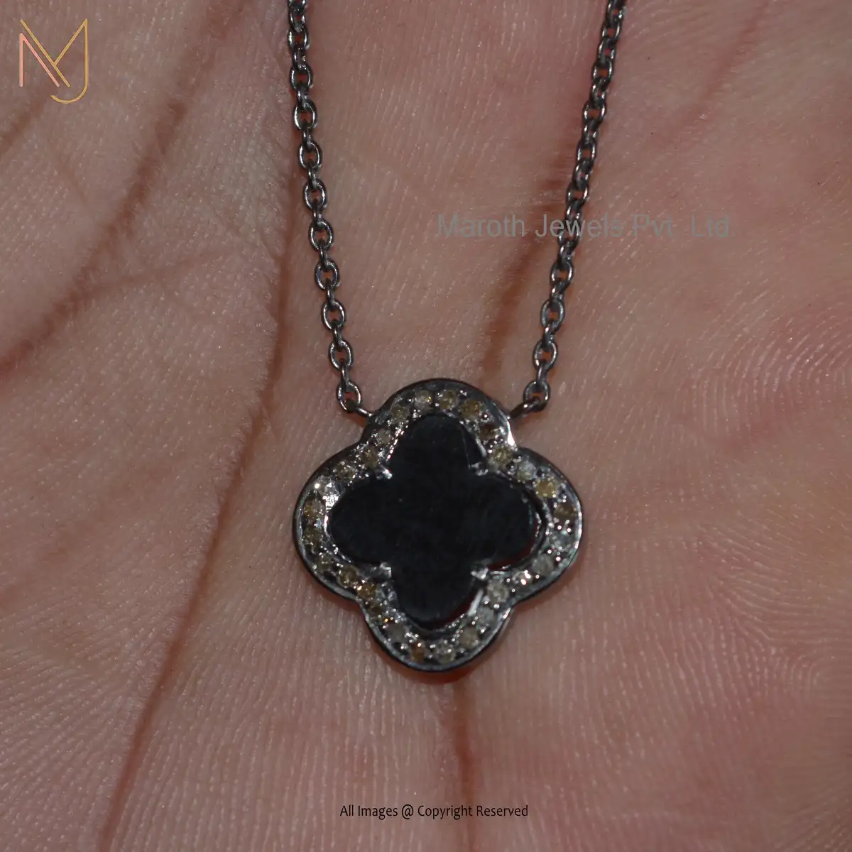 Wholesale 925 Silver Rhodium Pave Diamond & Black Spinel Clover Pendant Necklace