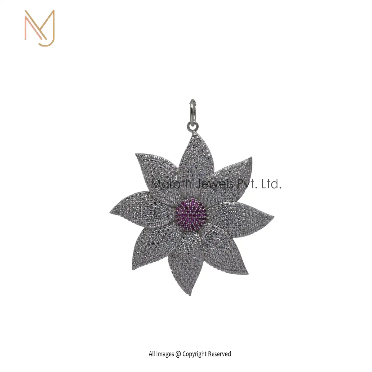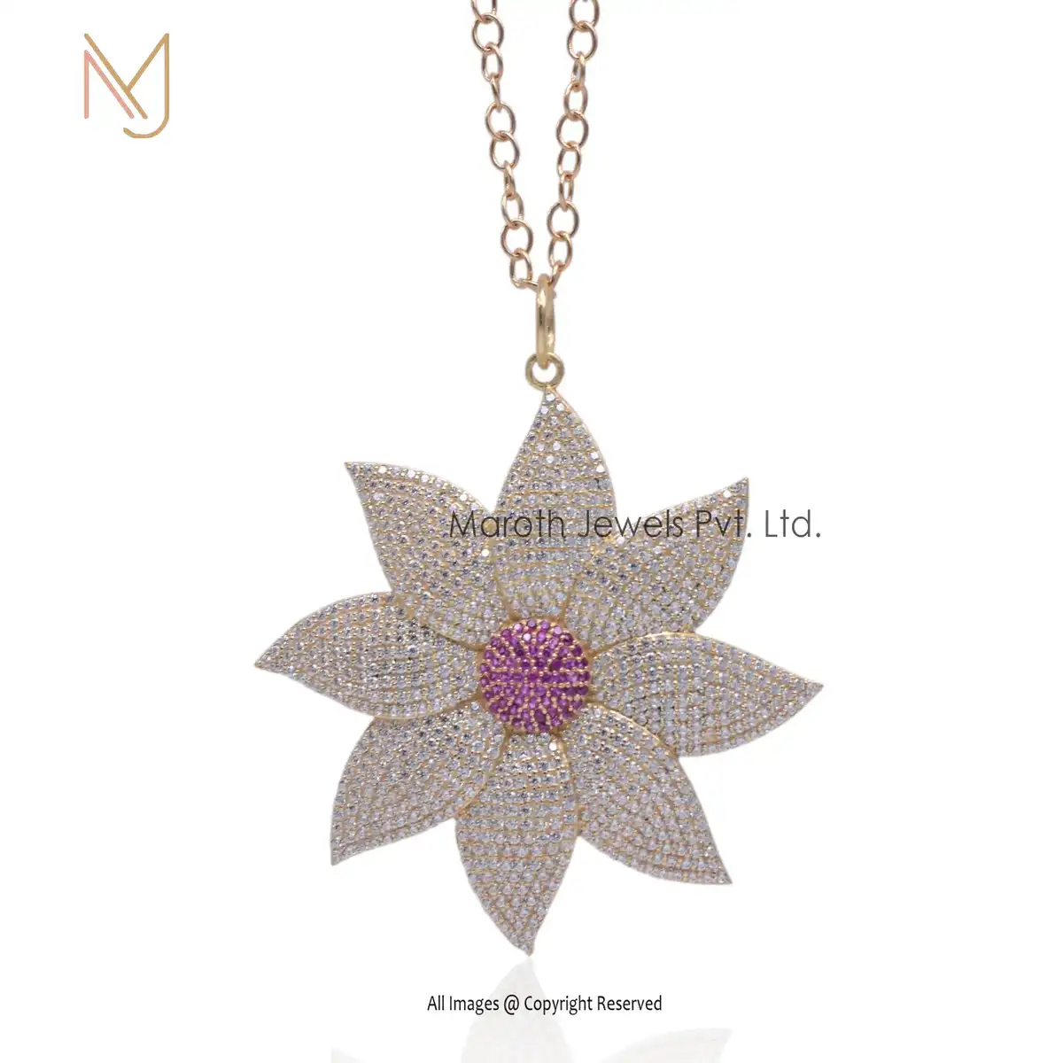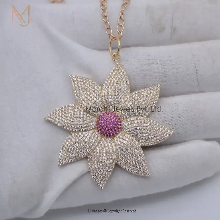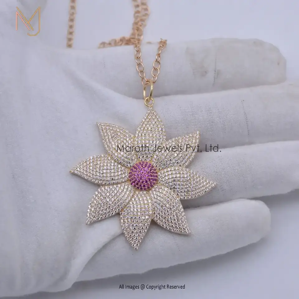 Wholesale 925 Silver Yellow Gold Plated Cubic Zircon & Pink Sapphire Flowers Designer Pendant Jewelry