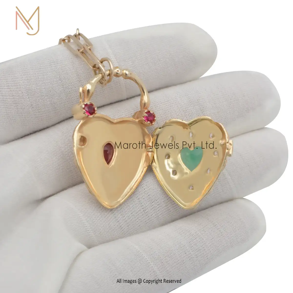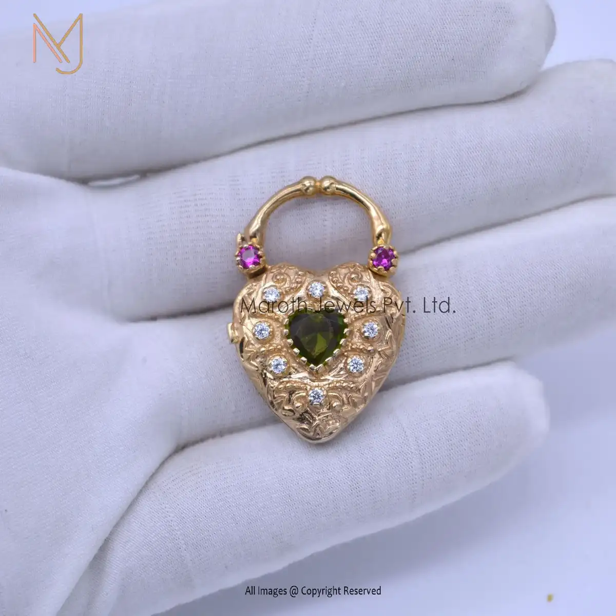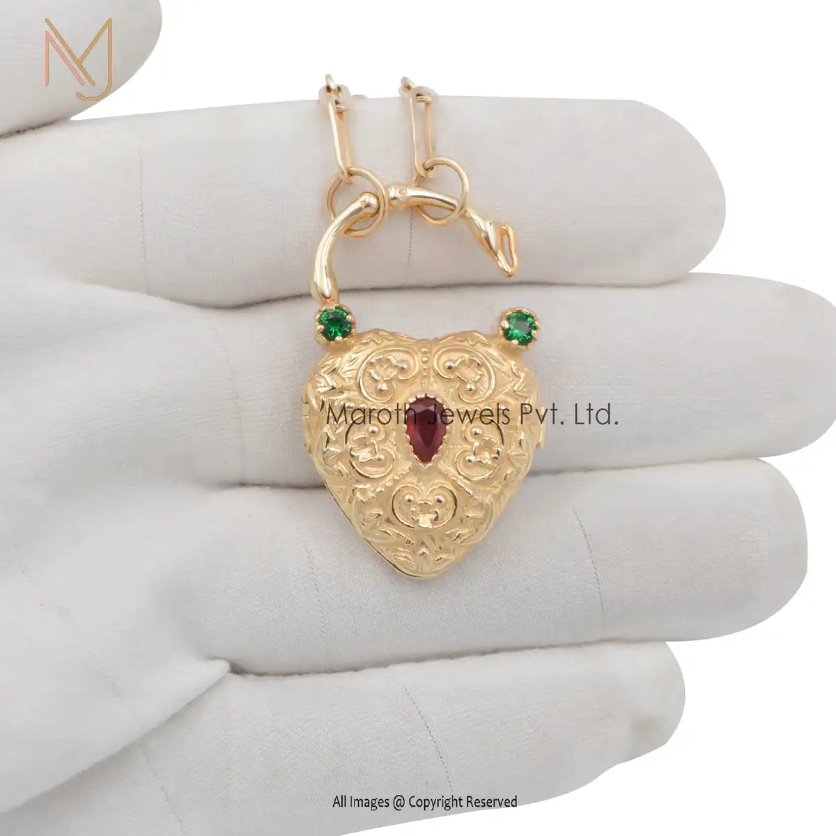 14K Yellow Gold CZ & Ruby Green Onyx Heart Padlock Pendant Jewelry USA