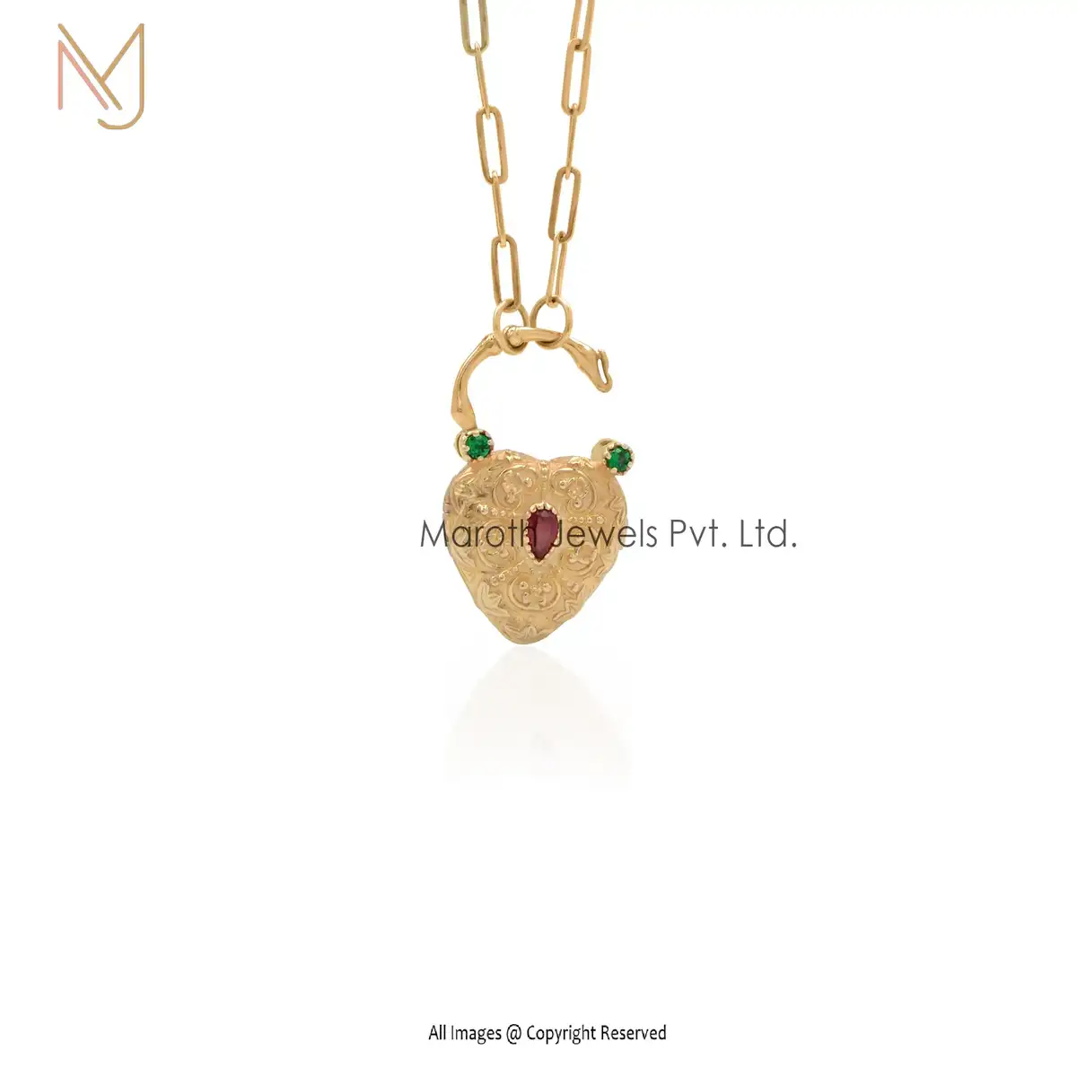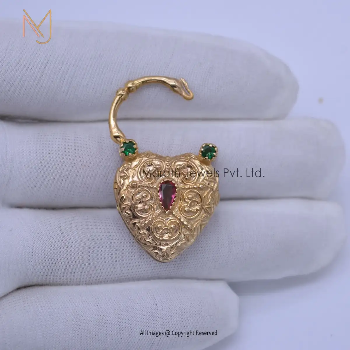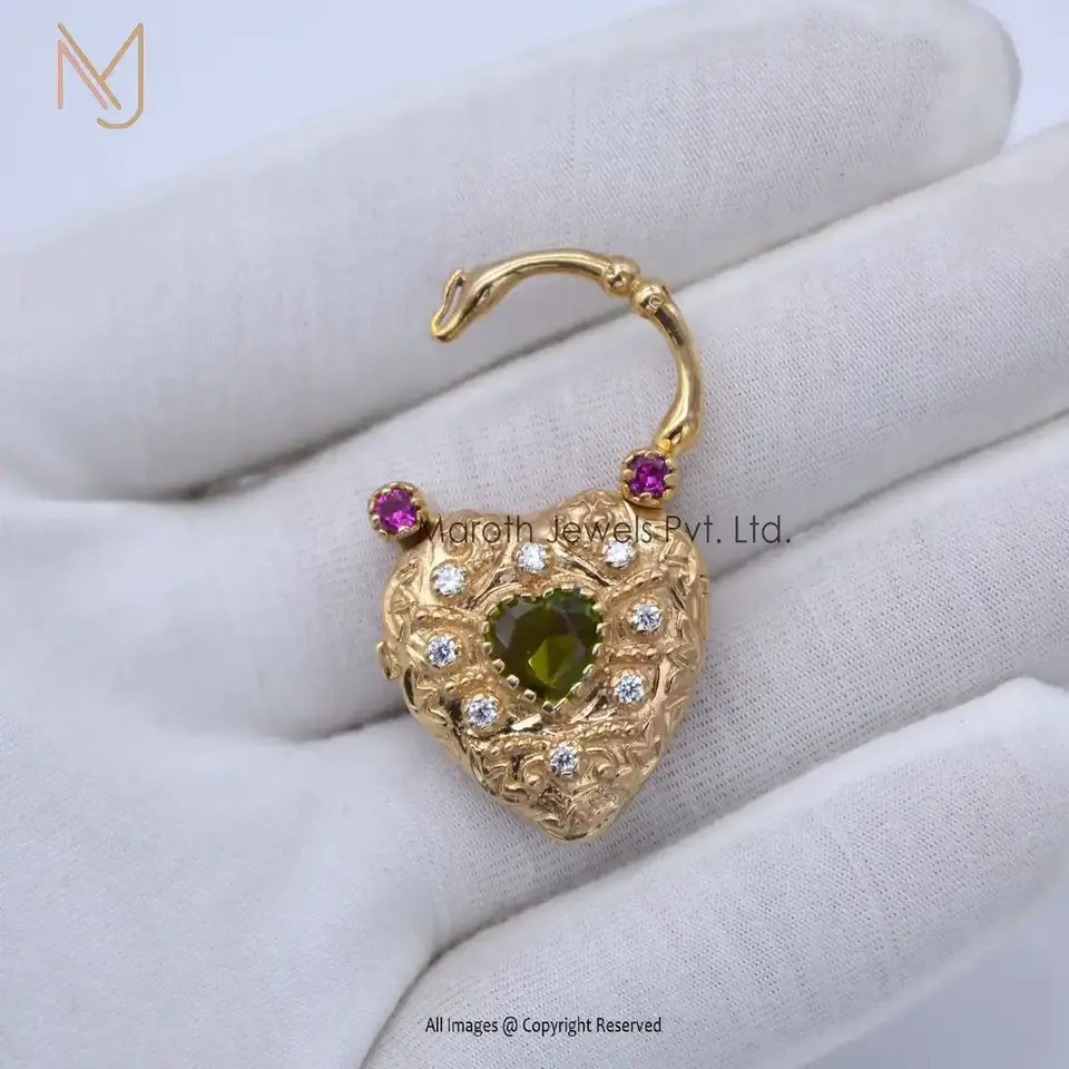 14K Yellow Gold CZ & Ruby Green Onyx Heart Padlock Pendant Jewelry USA