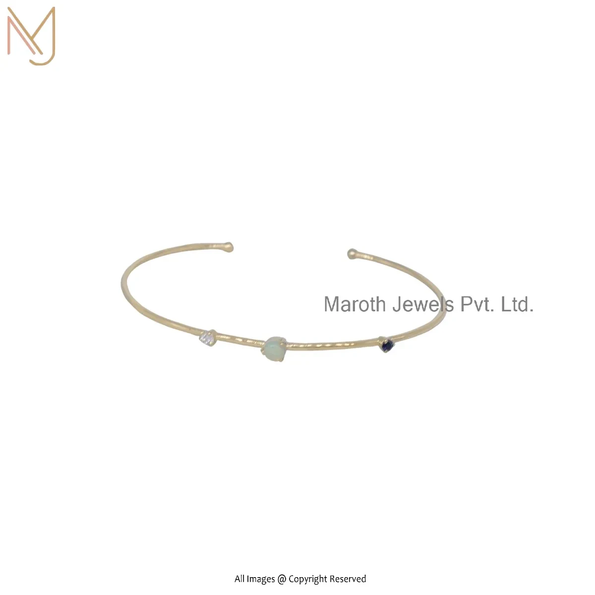 14K Yellow Gold Opal Diamond & Blue Sapphire Cuff Bangle Custom Jewelry