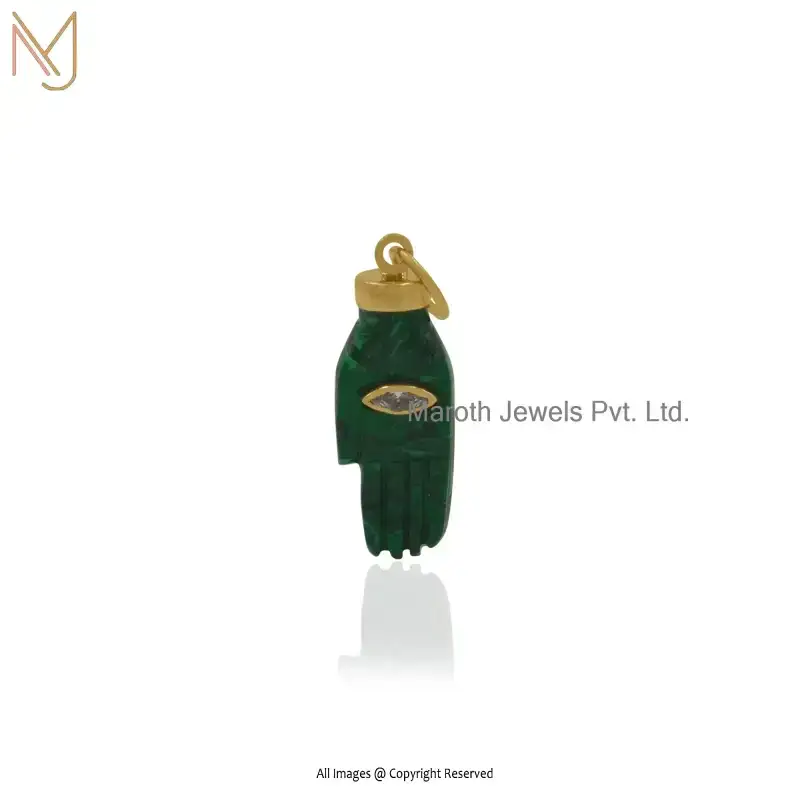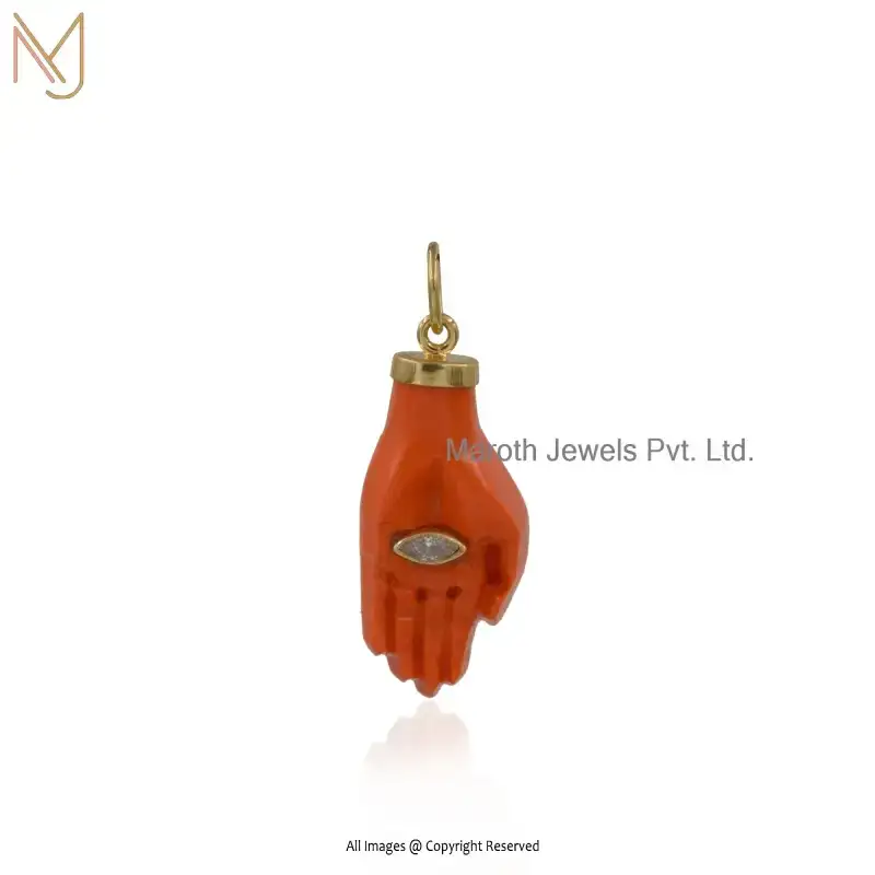 14K Yellow Gold Orange Coral And White CZ Coral Hamsa Hand Charm Pendant USA