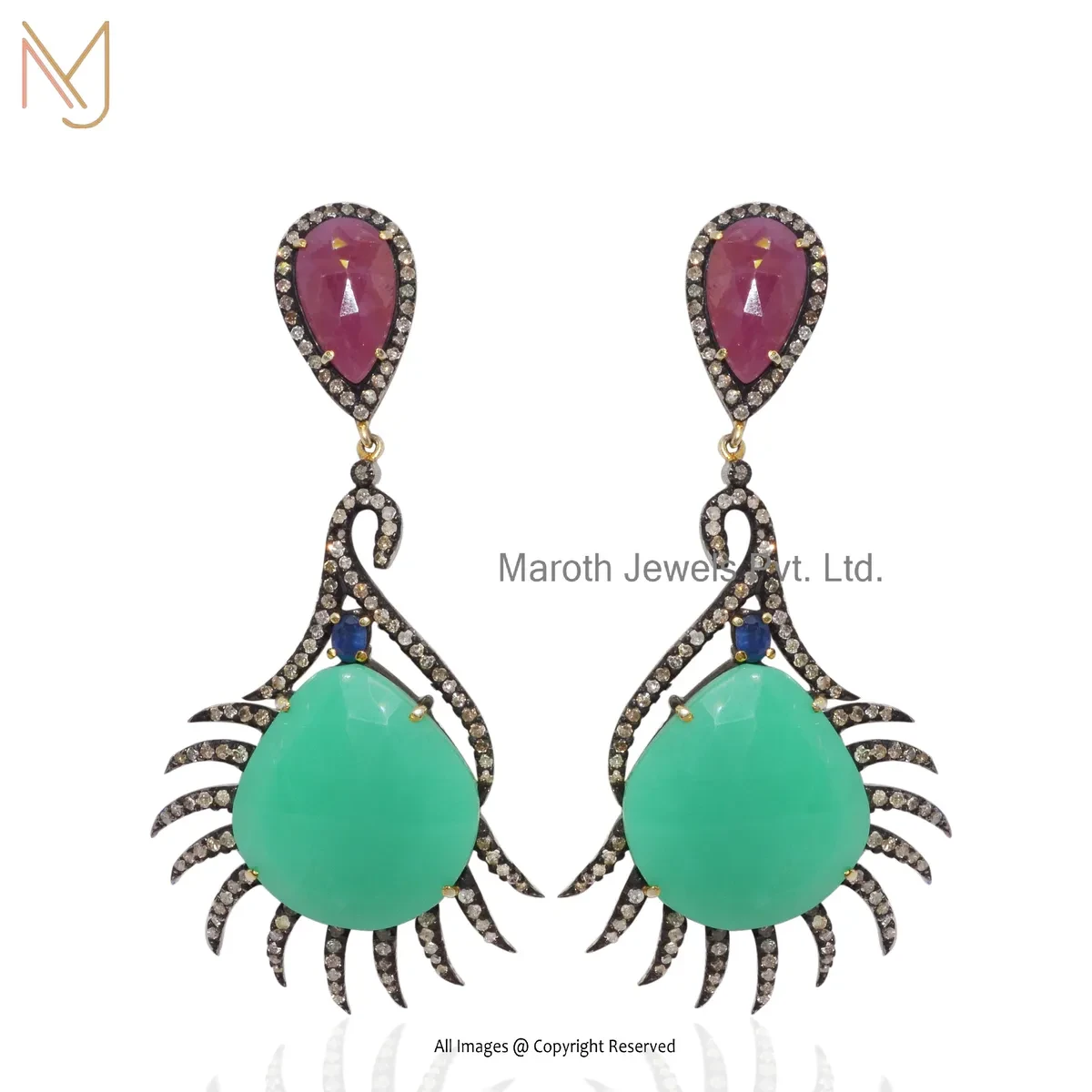 14K Yellow Gold Pave Diamond , Ruby , Blue Sapphire , Green Onyx Dangle Earring USA
