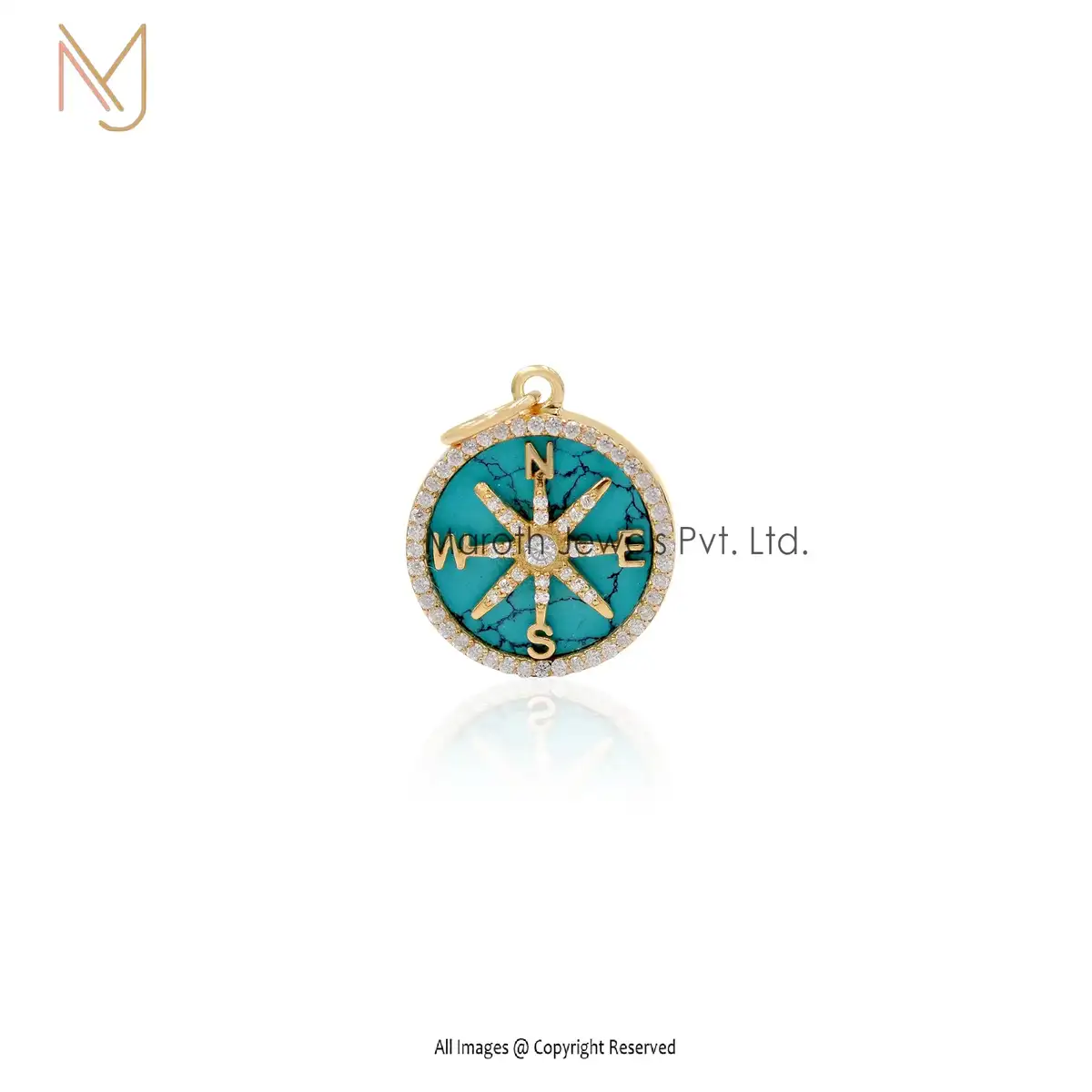 14K Yellow Gold Turquoise And White CZ Compass Pendant Jewelry Supplier