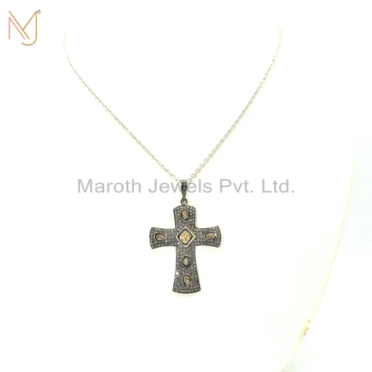 925 Silver Black Rhodium Pave Diamond Rose Cut Diamond Cross Pendant Custom Jewelry