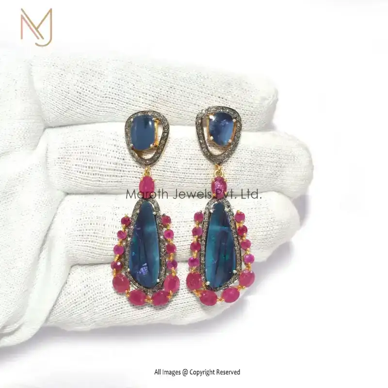 925 Silver Black Rhodium Yellow Gold Plated Pave Diamond Ruby Blue Sapphire Gemstone Earrings Custom Jewelry