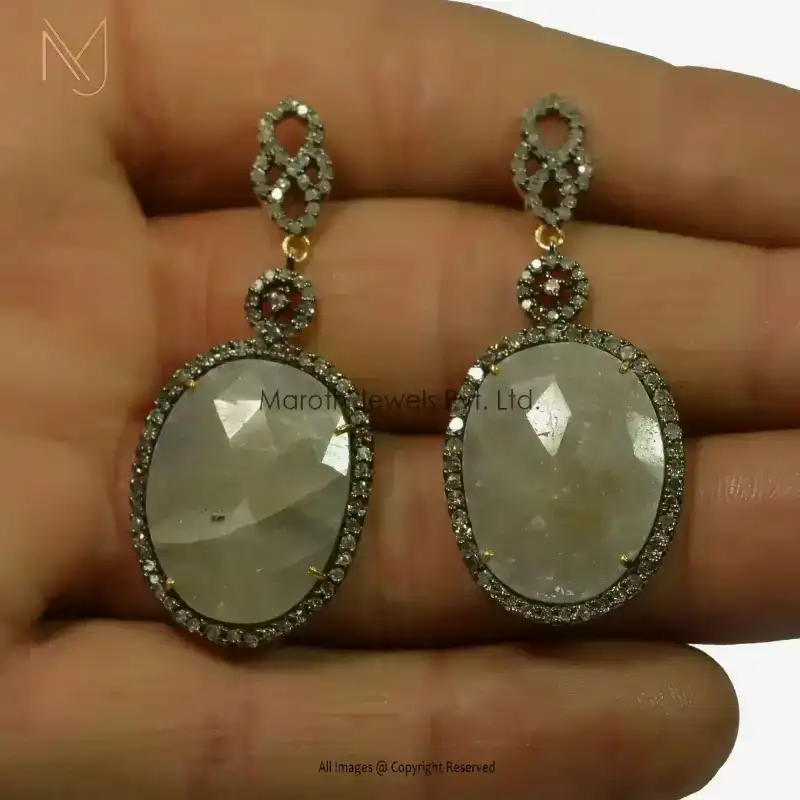 925 Silver Pave Diamond And Designer Moonstone Gemstone Drop Earrings Custom Jewelry