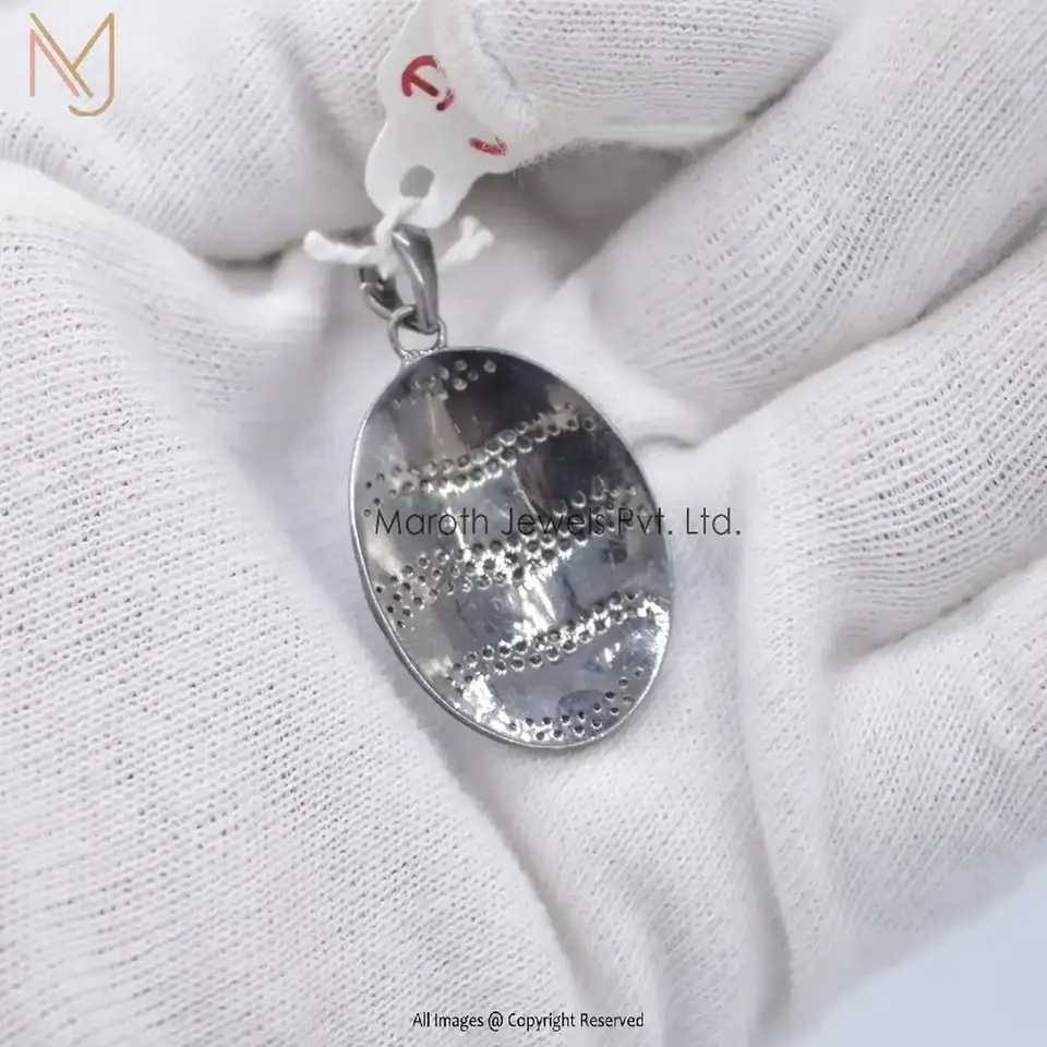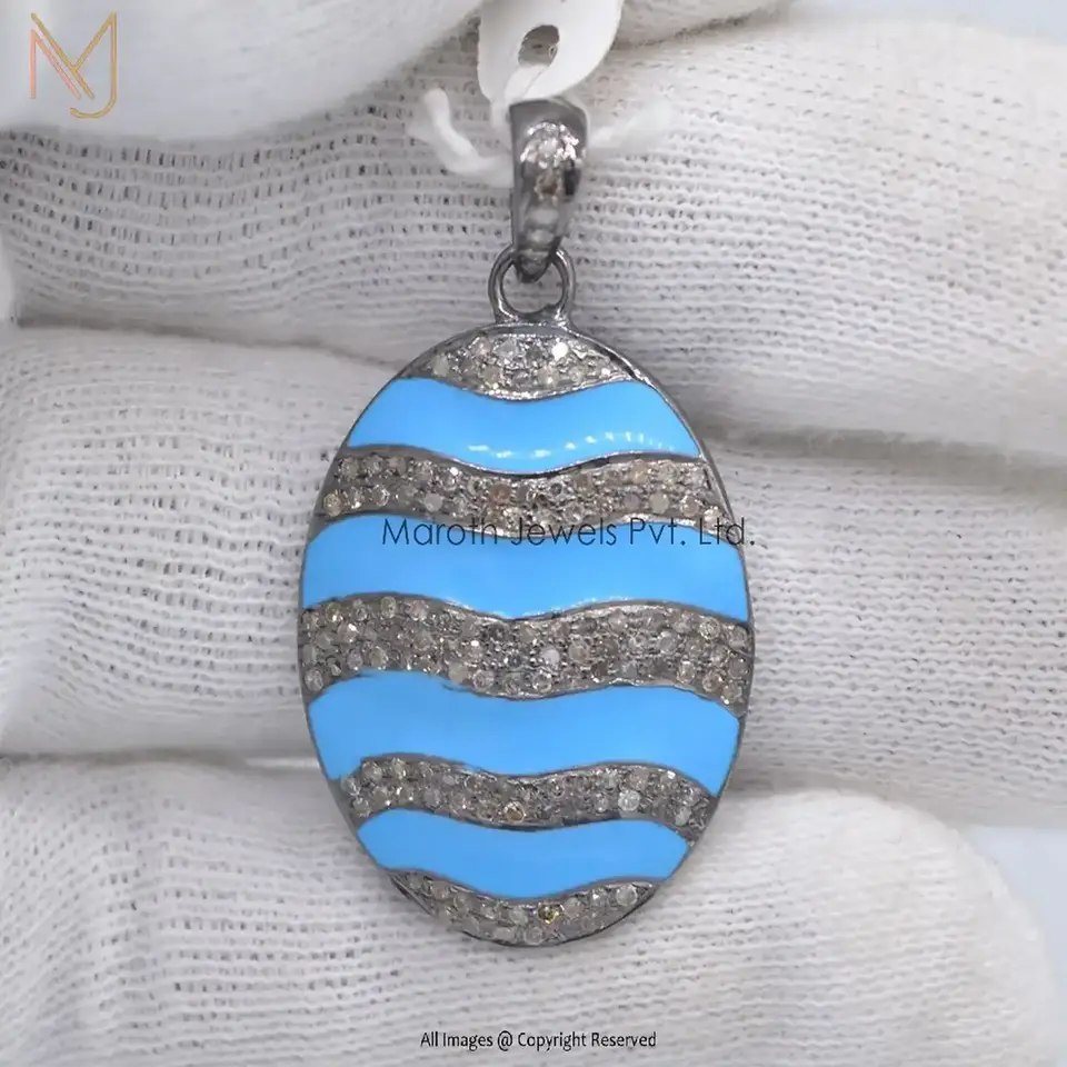 925 Silver Rhodium Plated Pave Diamond And Turquoise Enamel Pendant Custom Jewelry
