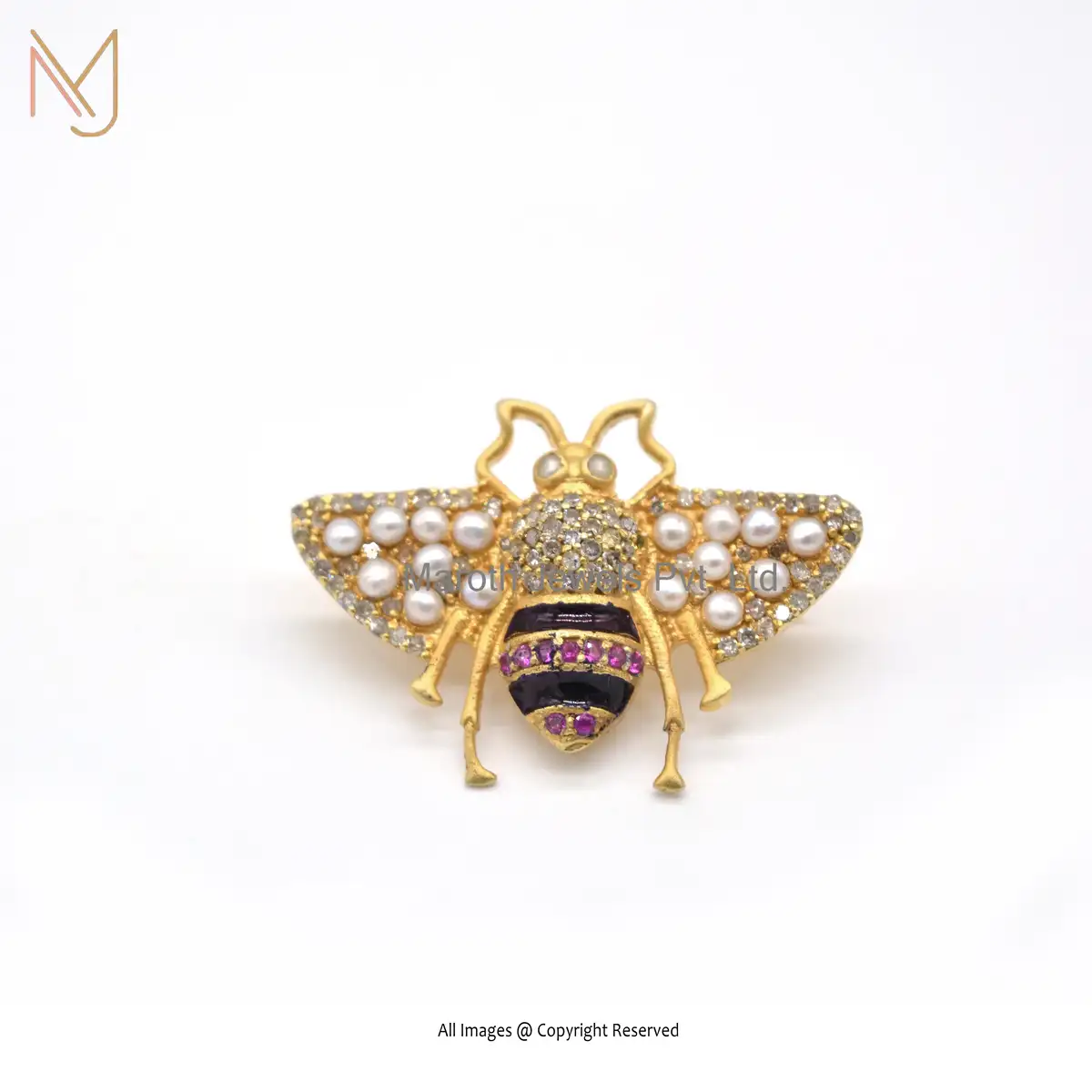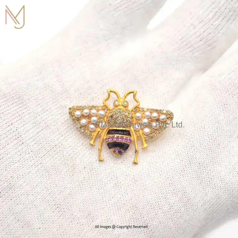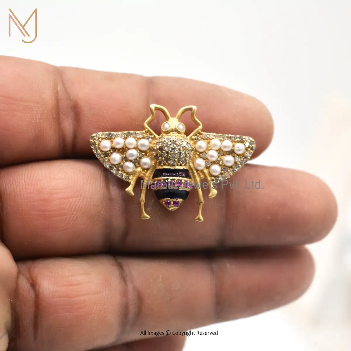 925 Silver Rhodium Plated Pave Diamond & Pearl Gemstone Honey Bee Pendant USA
