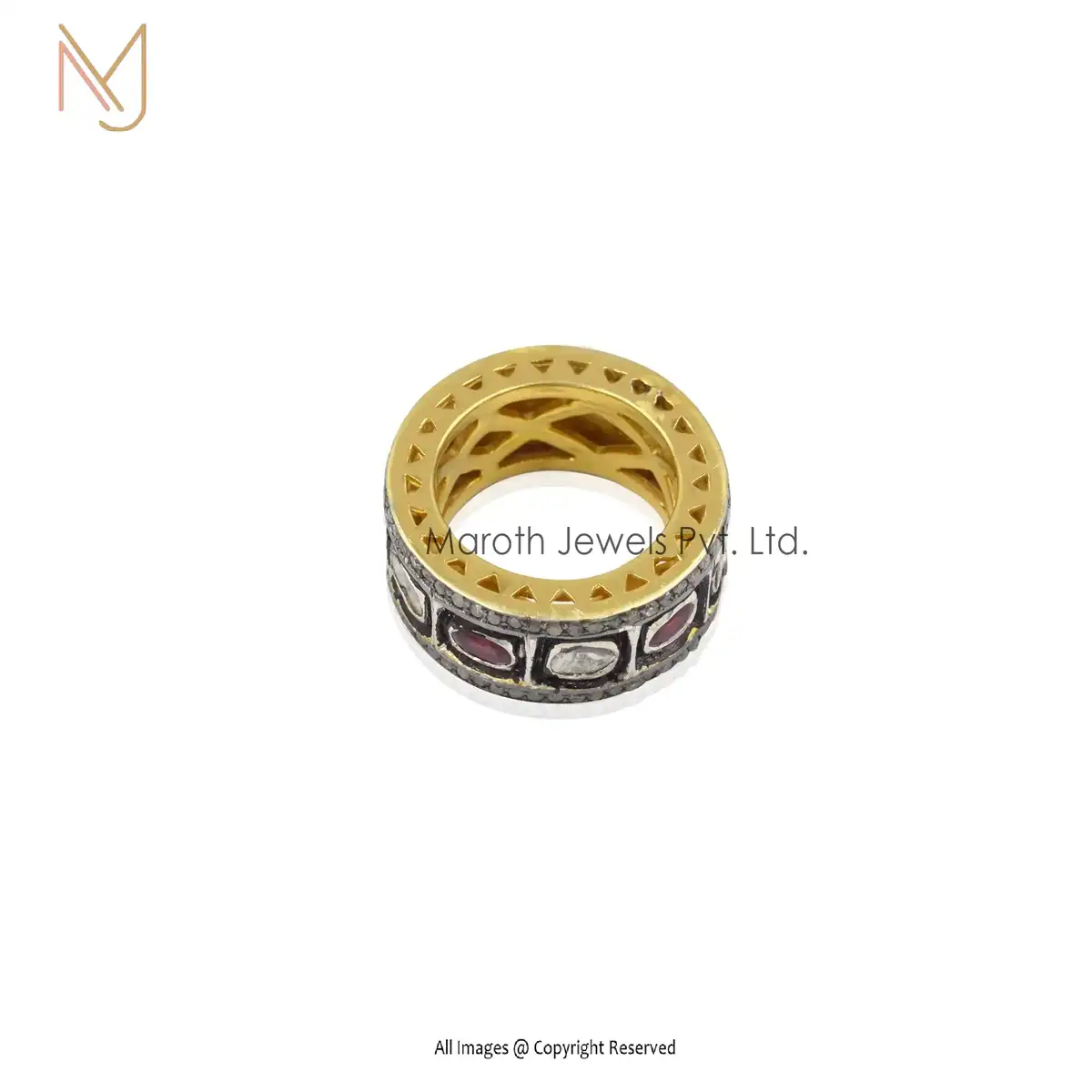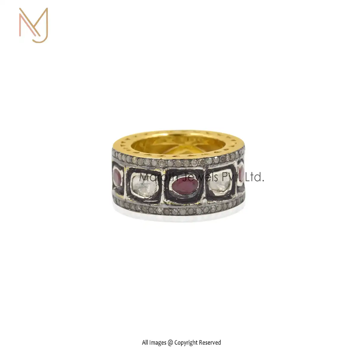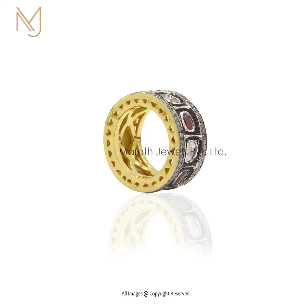 925 Silver Rhodium Yellow Gold Diamond Rose Cut And Ruby Gemstone Round Band Ring Jewelry Manufacturer